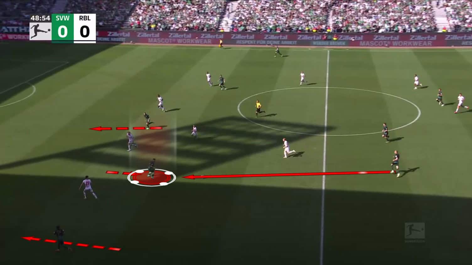 This now attracts the press of RB Leipzig, and their entire block moves forward and towards the right side of Werder.