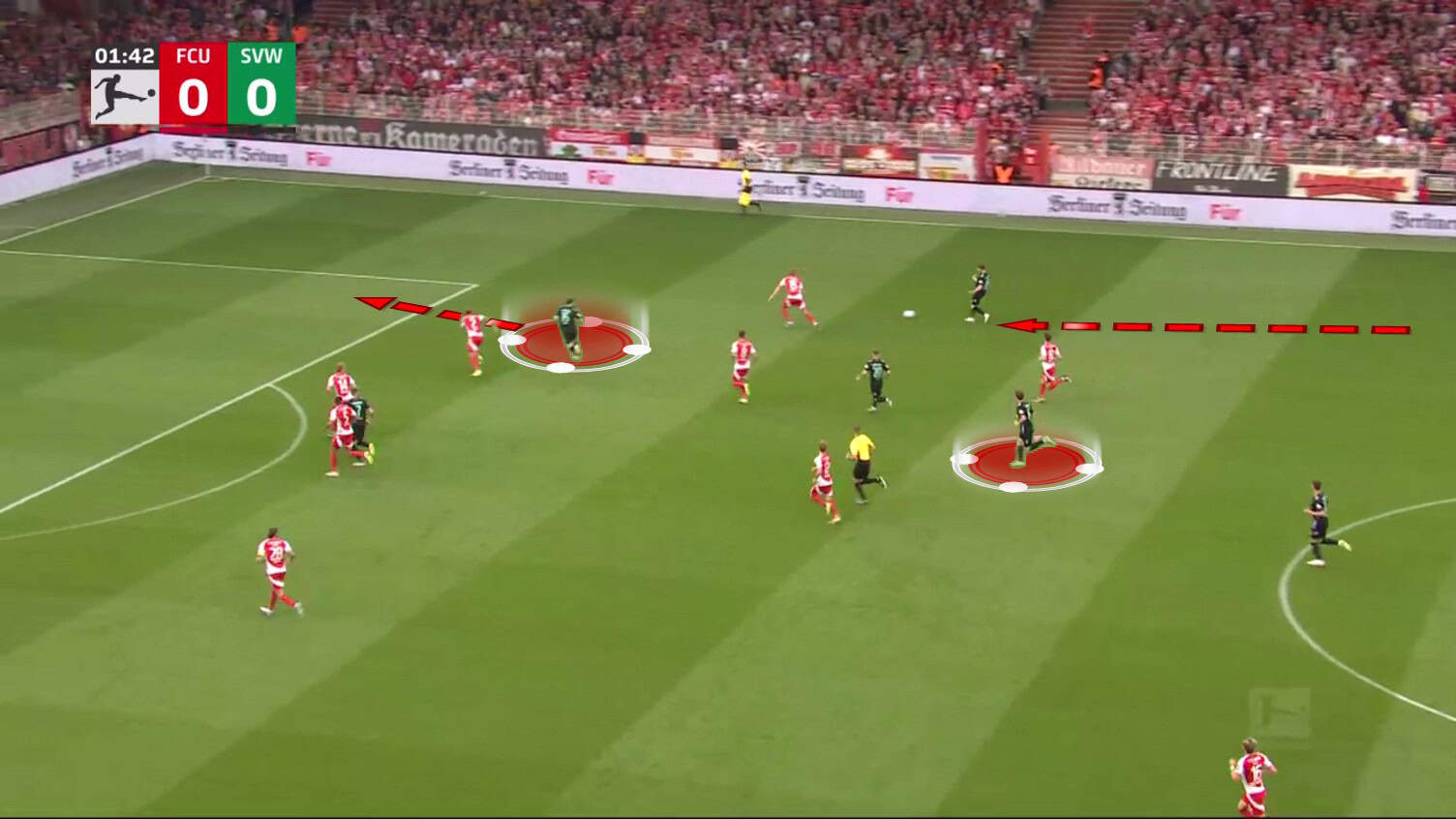 Examining a typical Werder attack from this past season, we can see this situation early in the game against Union Berlin.