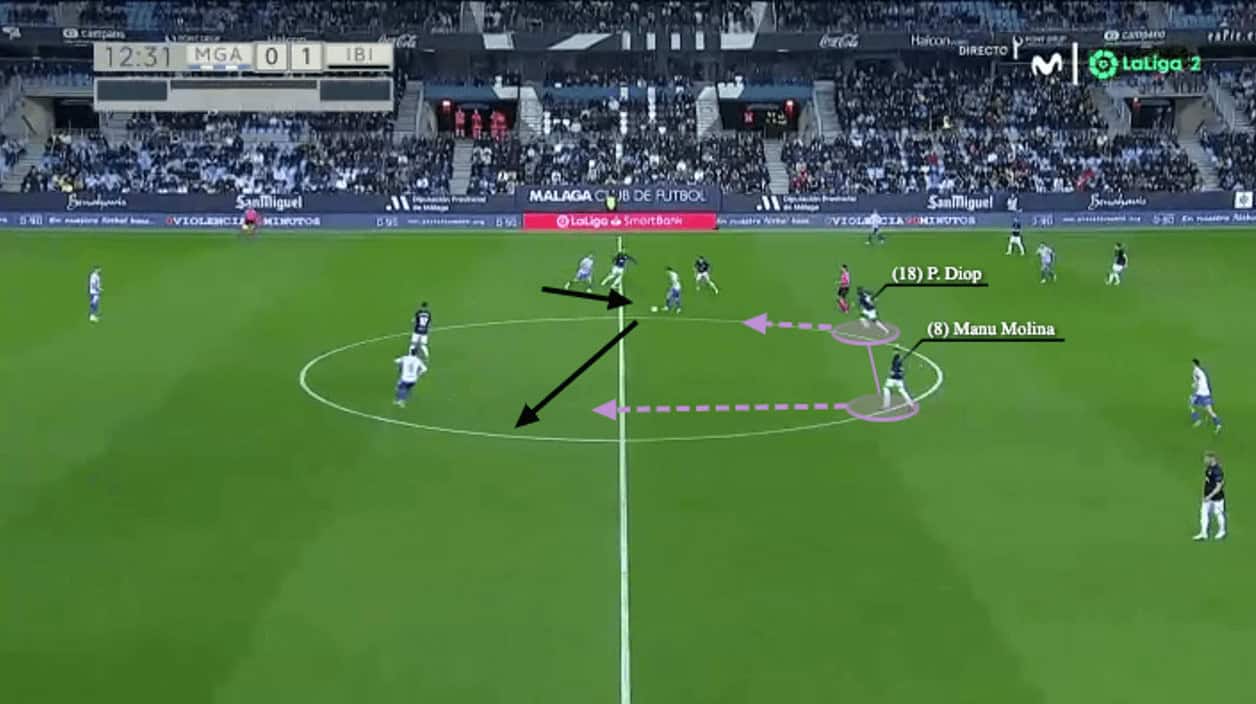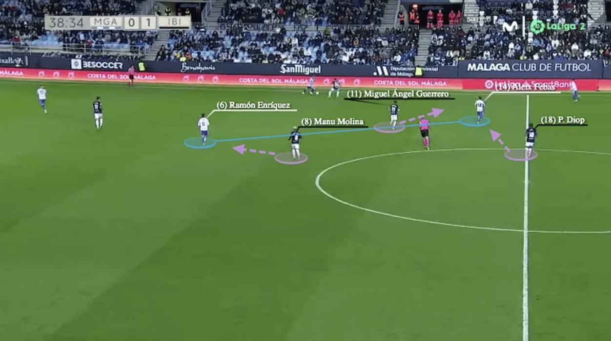 So, even the Malága 6s split to stretch Ibiza, they had enough coverage. As highlighted above, Ramón Enríquez and Aleix Febas spread two horizontal grids to separate Guerrero and Molina, but Ibiza were very compact because Diop always scanned and covered his teammates from the centre. Even the pressing intensity of the 35-year-old midfielder might be lacking, he was good at delaying the progression of the attack with his body orientation.