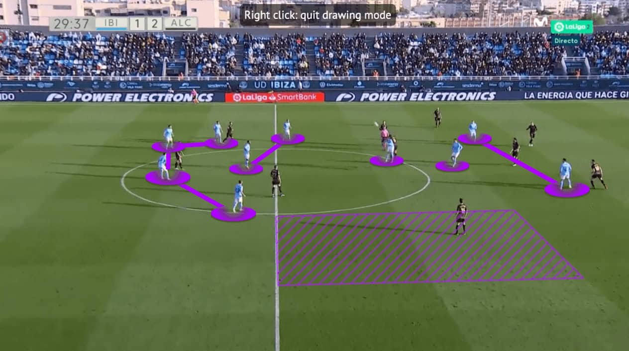 Initially, the shape of Ibiza was a 2-2 because that was natural from their formation. However, the 6s was not moving behind the first line to receive the ball, and most of the time one of them would drop out as a half centre-back or as the third centre-back to receive. That also created a “+1” advantage against teams pressing with two strikers (3v2). But that 3v2 can also be formed by the goalkeeper as Álex Domínguez was required to participate in the attack as well. The above image shows Ibiza were able to bypass the first pressing line because the centre-back used the maximum width of the pitch. Then, finding Diop in the centre.