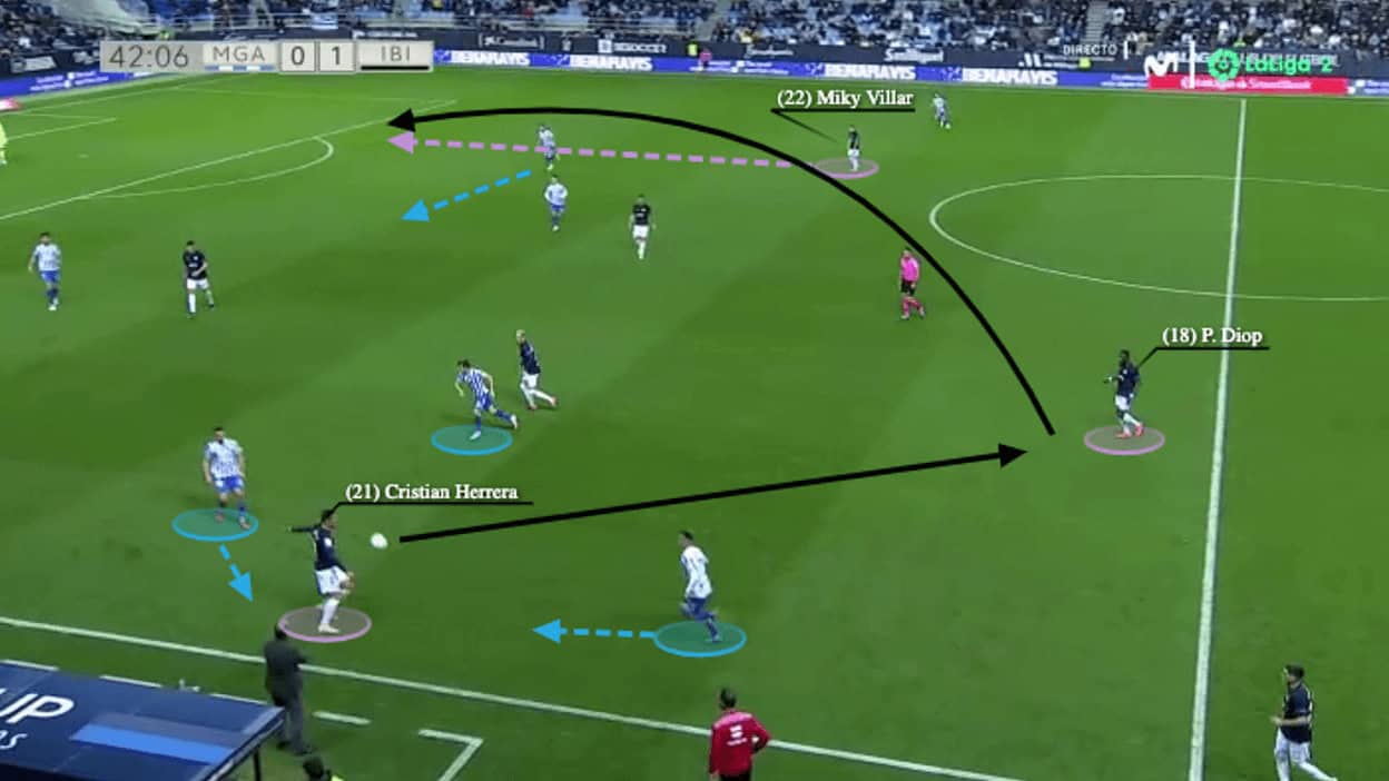 In the construction of the attack, the core was the four deep players in the centre as they must be deep. In the build-up, the full-backs mostly provide the width in the wide zones. Cifuentes was deeper in the first game but then Ibiza went out on the left side more often in the other two games. We must mention Escobar’s impressive performance against Málaga as the 24-year-old Argentine was dynamic with his movements and decisions.