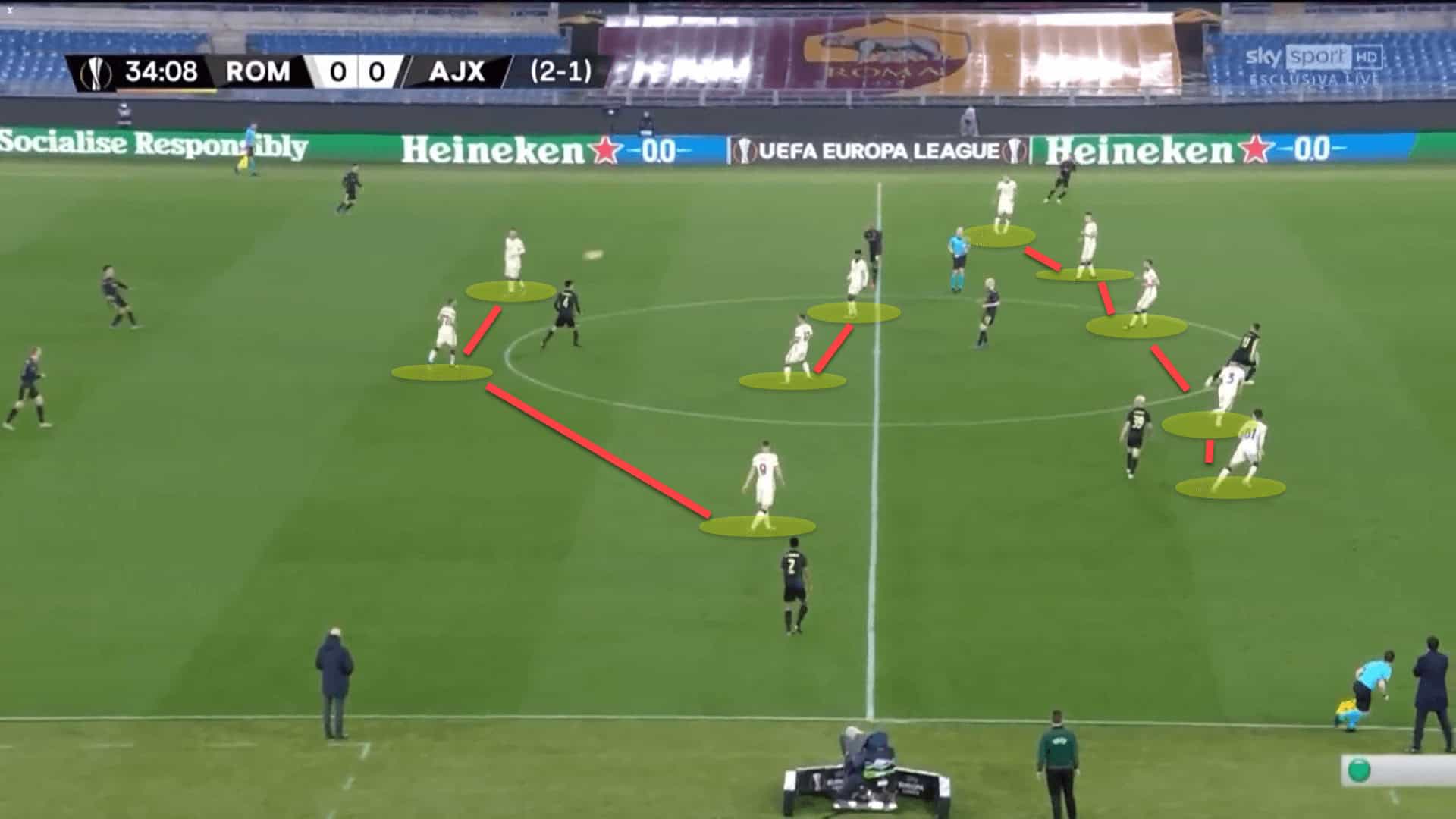Instead, Roma’s three forwards and midfielders were remaining within close proximity to one another within their 5-3-2 defensive mid-block, cutting off the passing lanes into the double-pivot Ajax had created behind the first line of pressure.