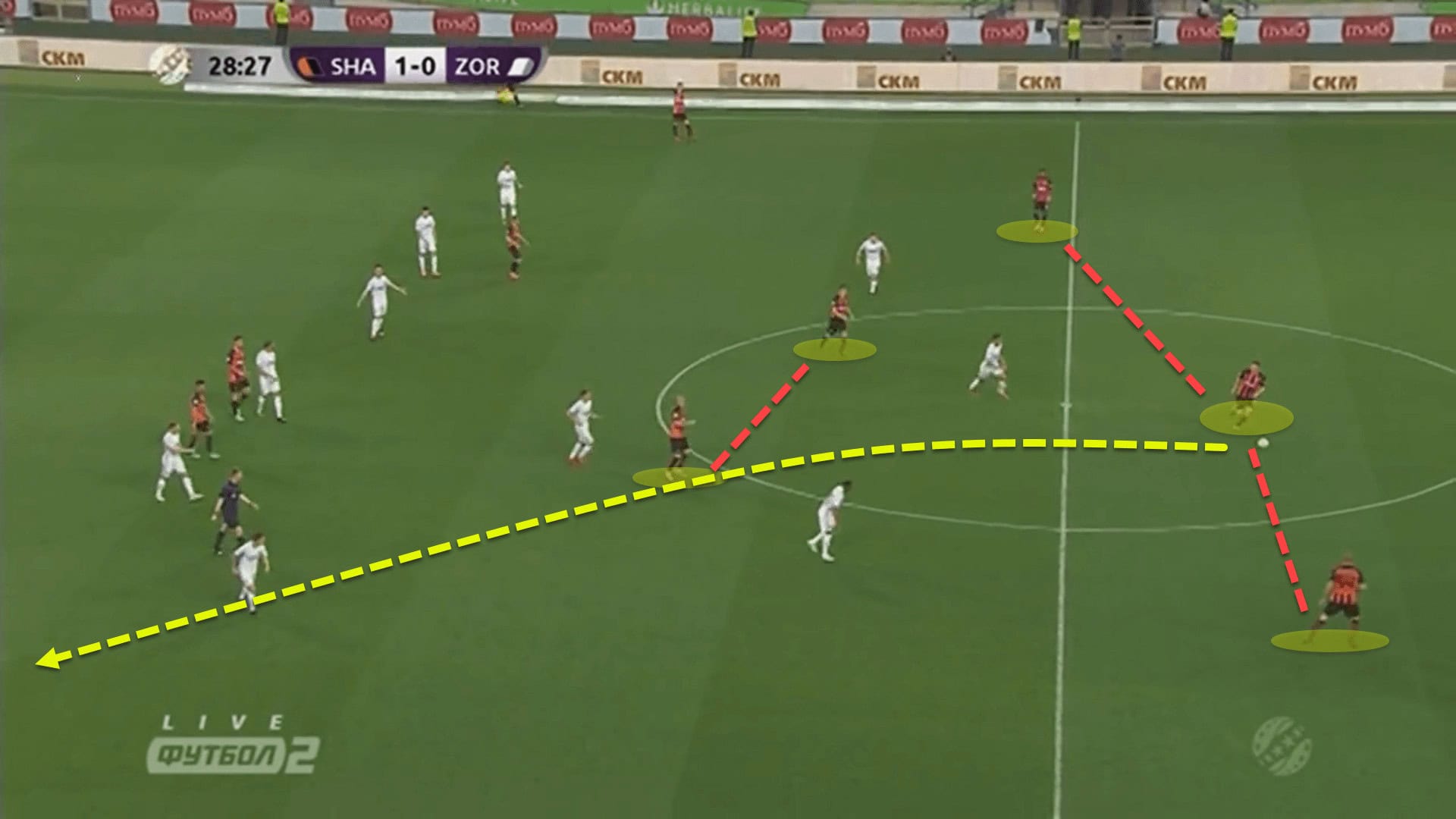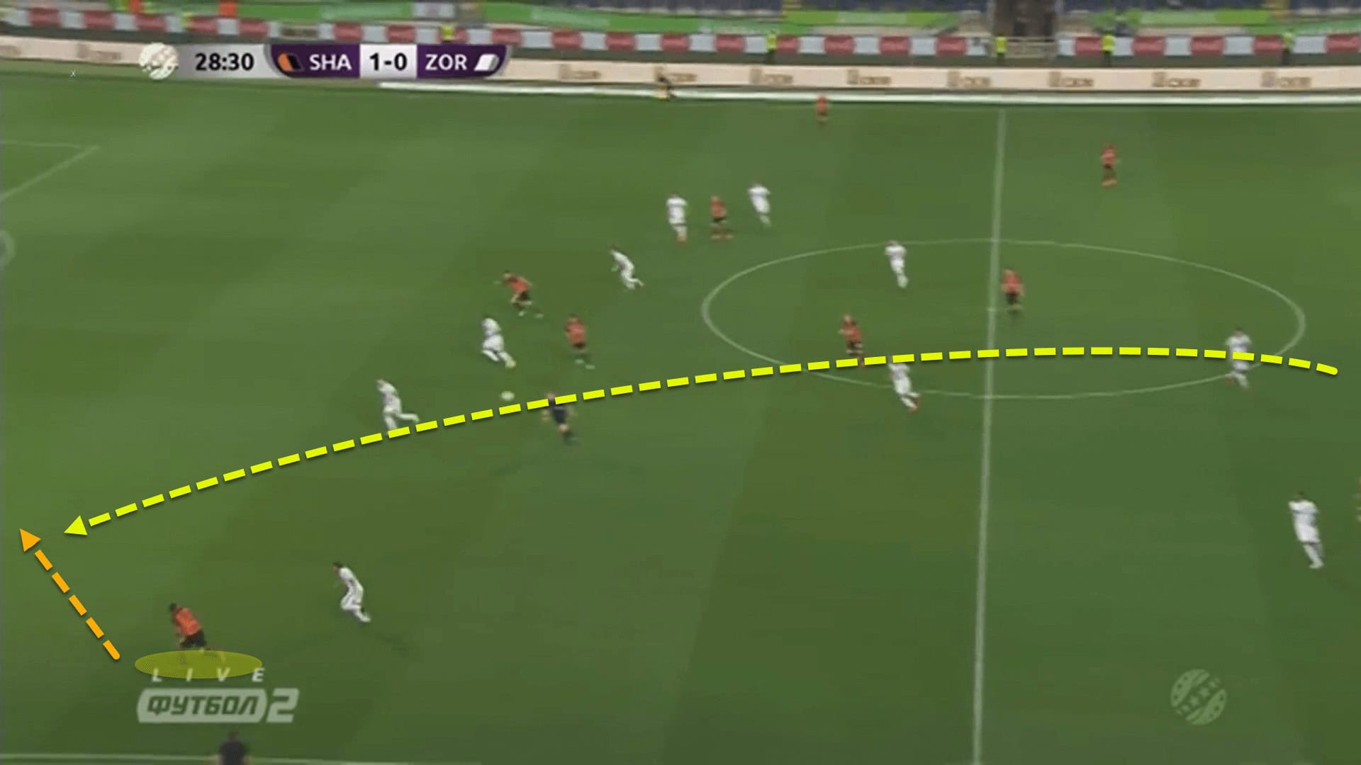 The Ukrainian giants played a short backwards pass which acted as a trigger for Zorya to step up and press. Knowing this, the fullback began his run and the centre-back picked him out with a pitch-perfect through ball, getting Shakhtar into a wonderful goalscoring position.