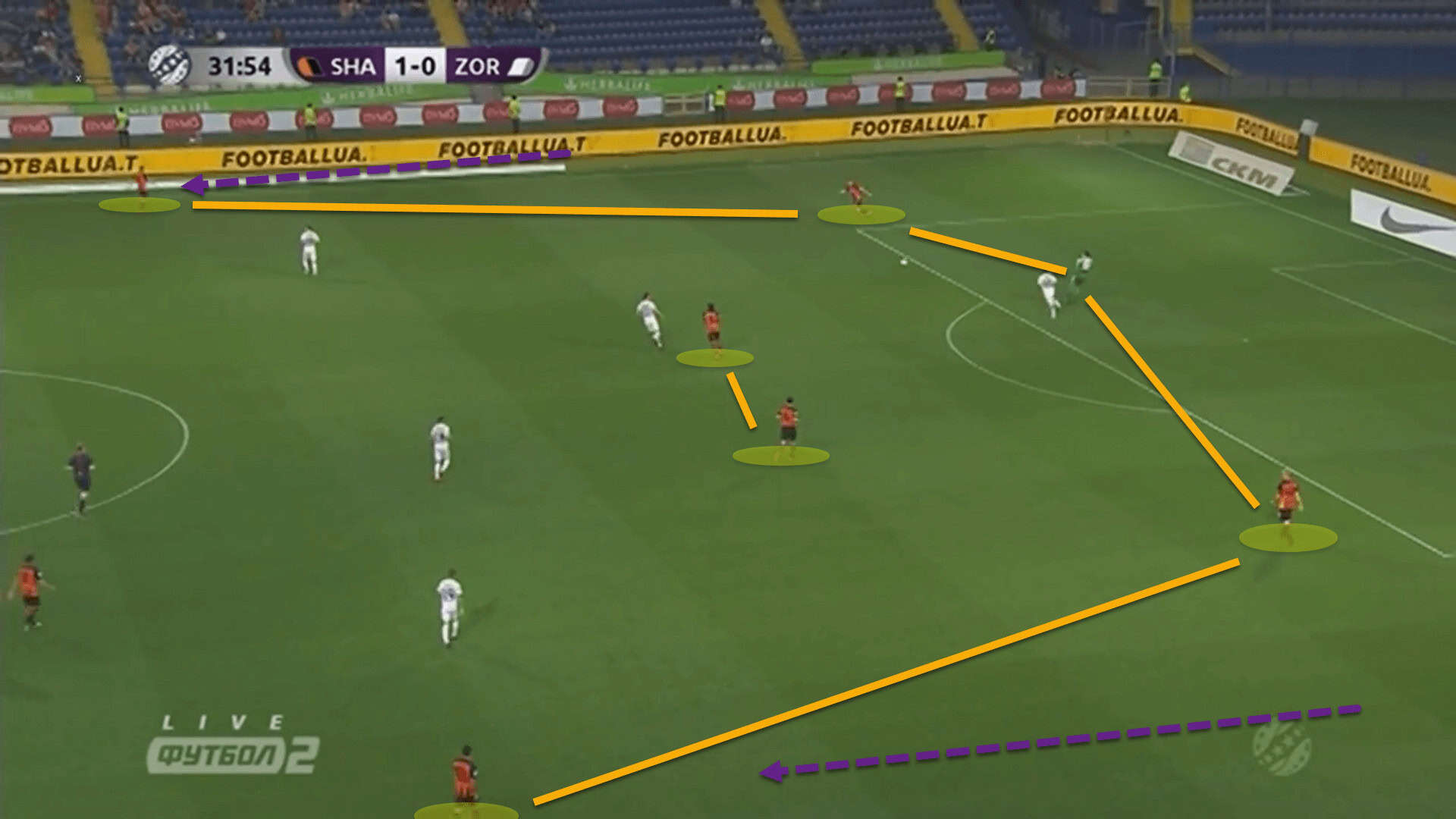 Shakhtar had overloaded the central corridors of the pitch, forcing Zorya Luhansk to narrow their defensive block. This has left space out wide for the fullbacks to run into.