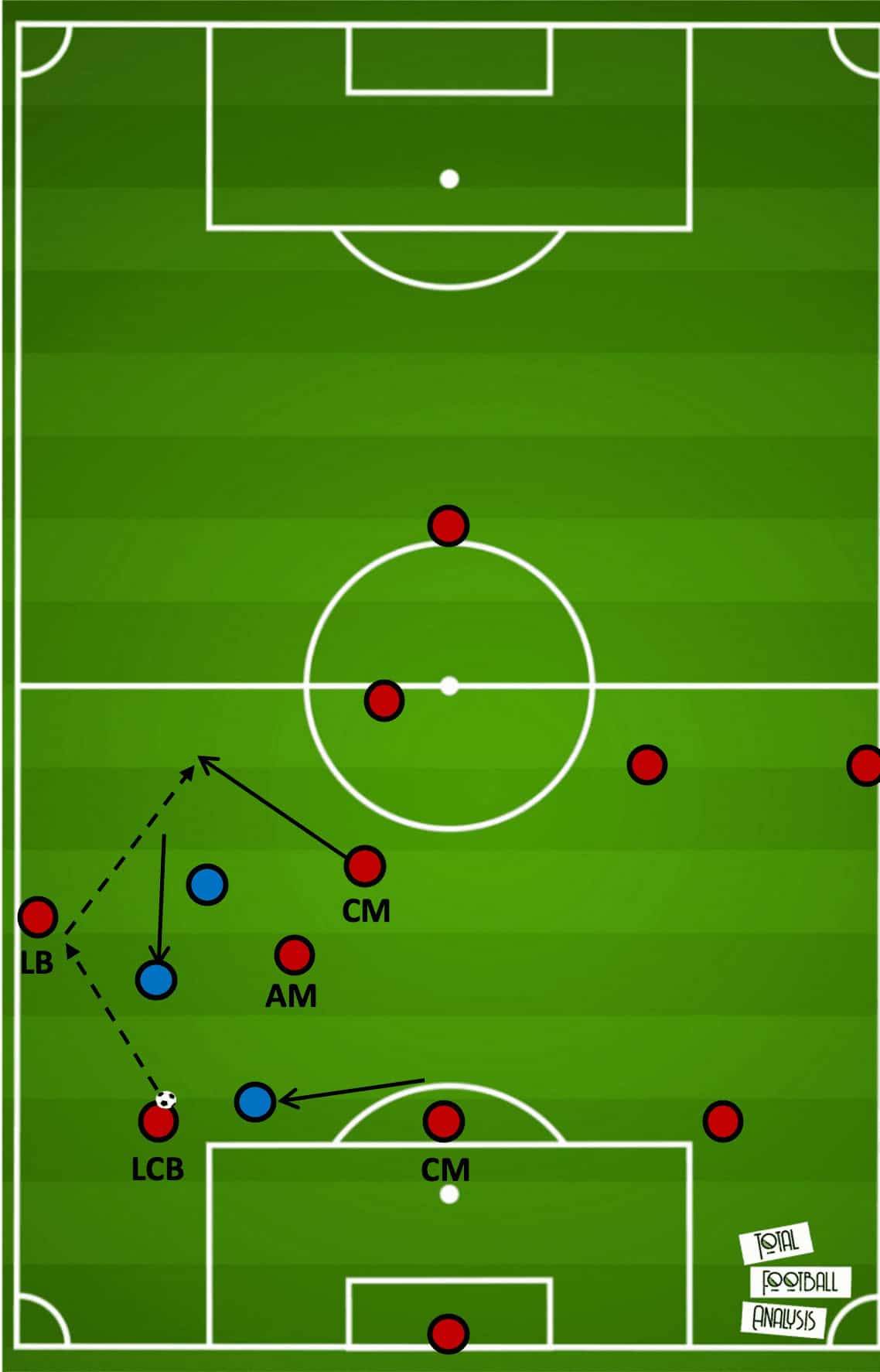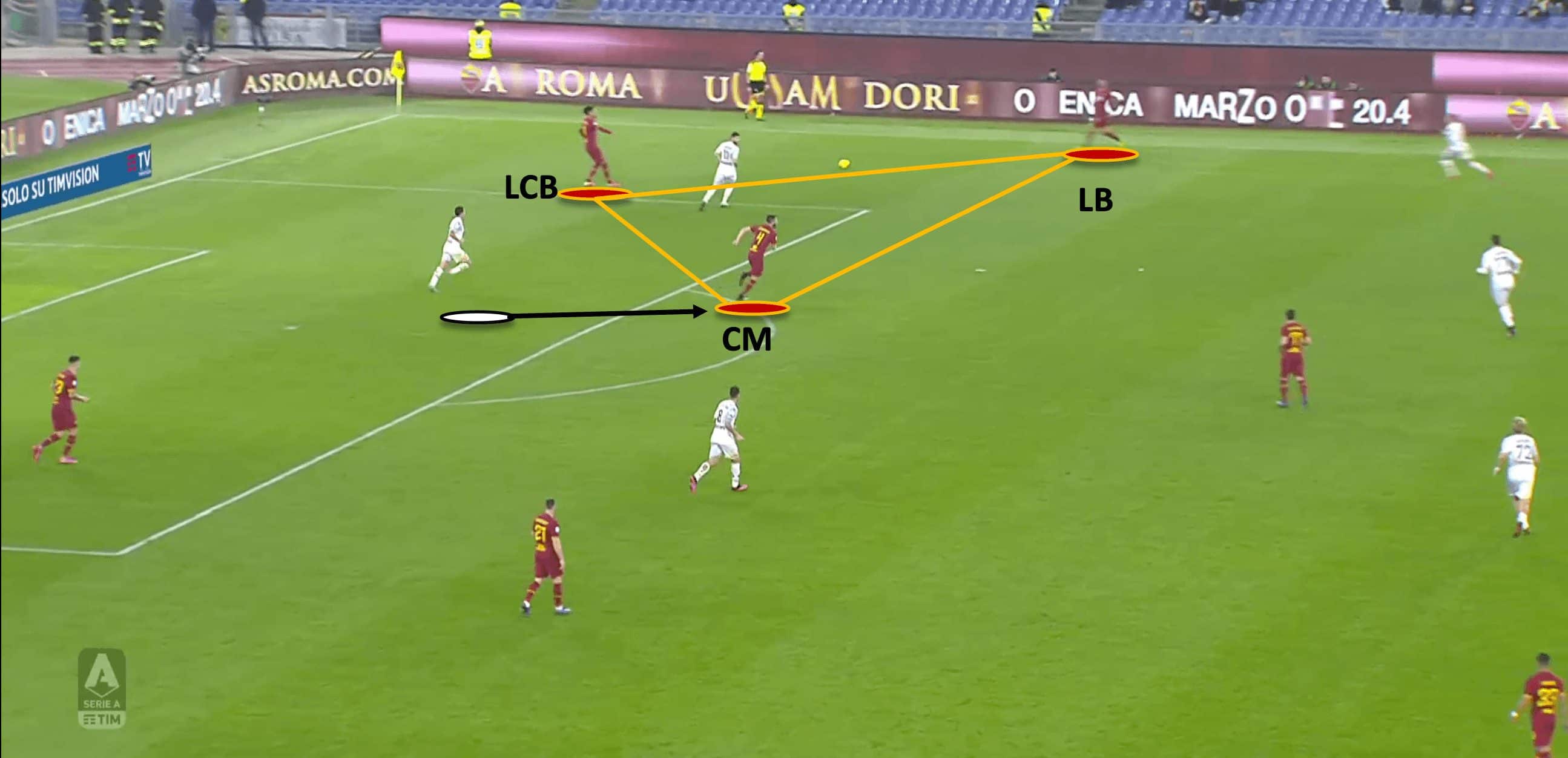 When the triangle is created, Roma can create an overload by having a central player (usually the pivot player on the far side) make a run from in to out, creating a passing option just ahead of the triangle. If the opponents within the triangle try to block passing lane, it will open up another one to a Roma player within the triangle. If the opponents do not attempt to block the passing lane, there is an uncontested vertical pass to play for Roma.