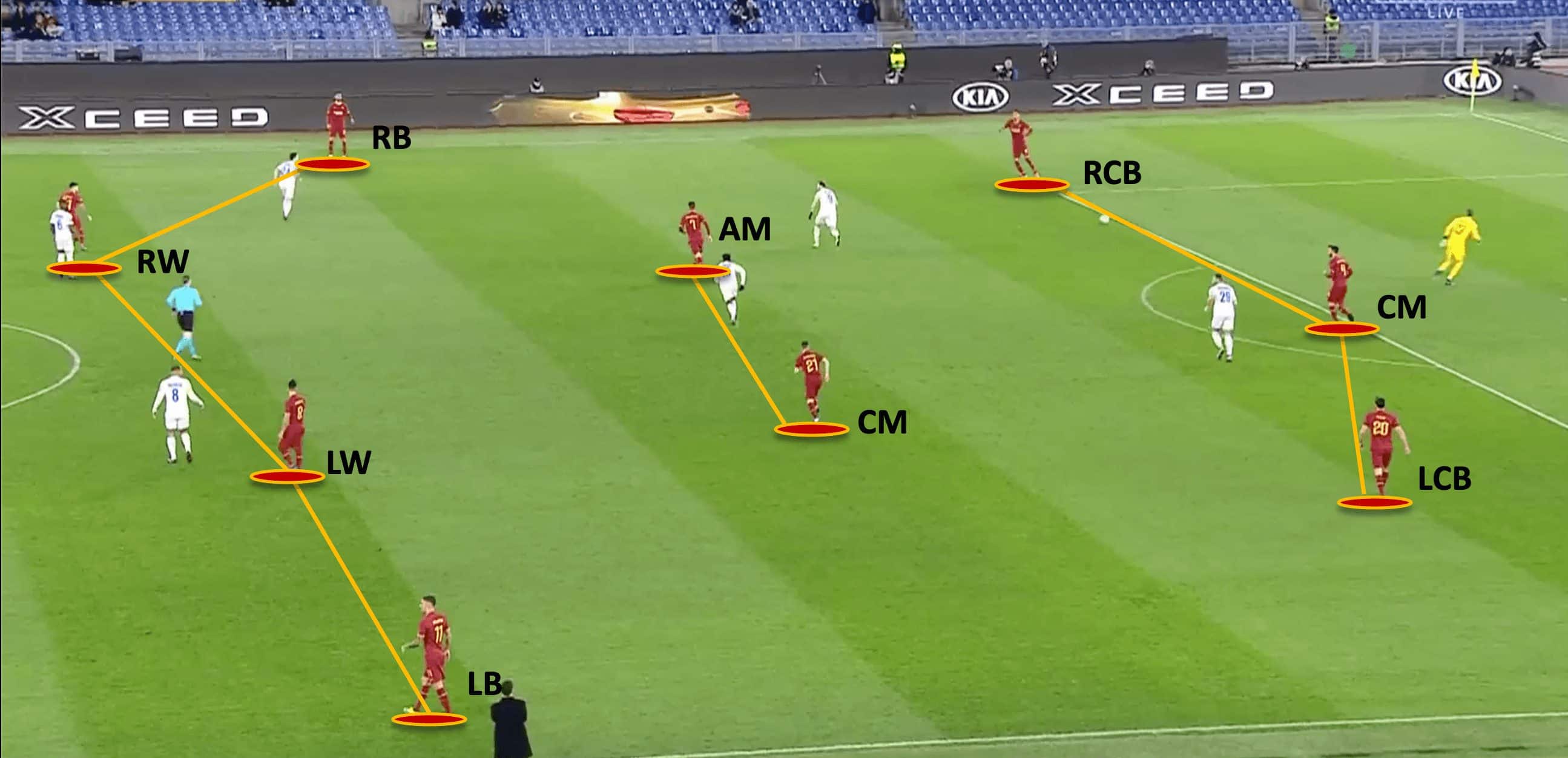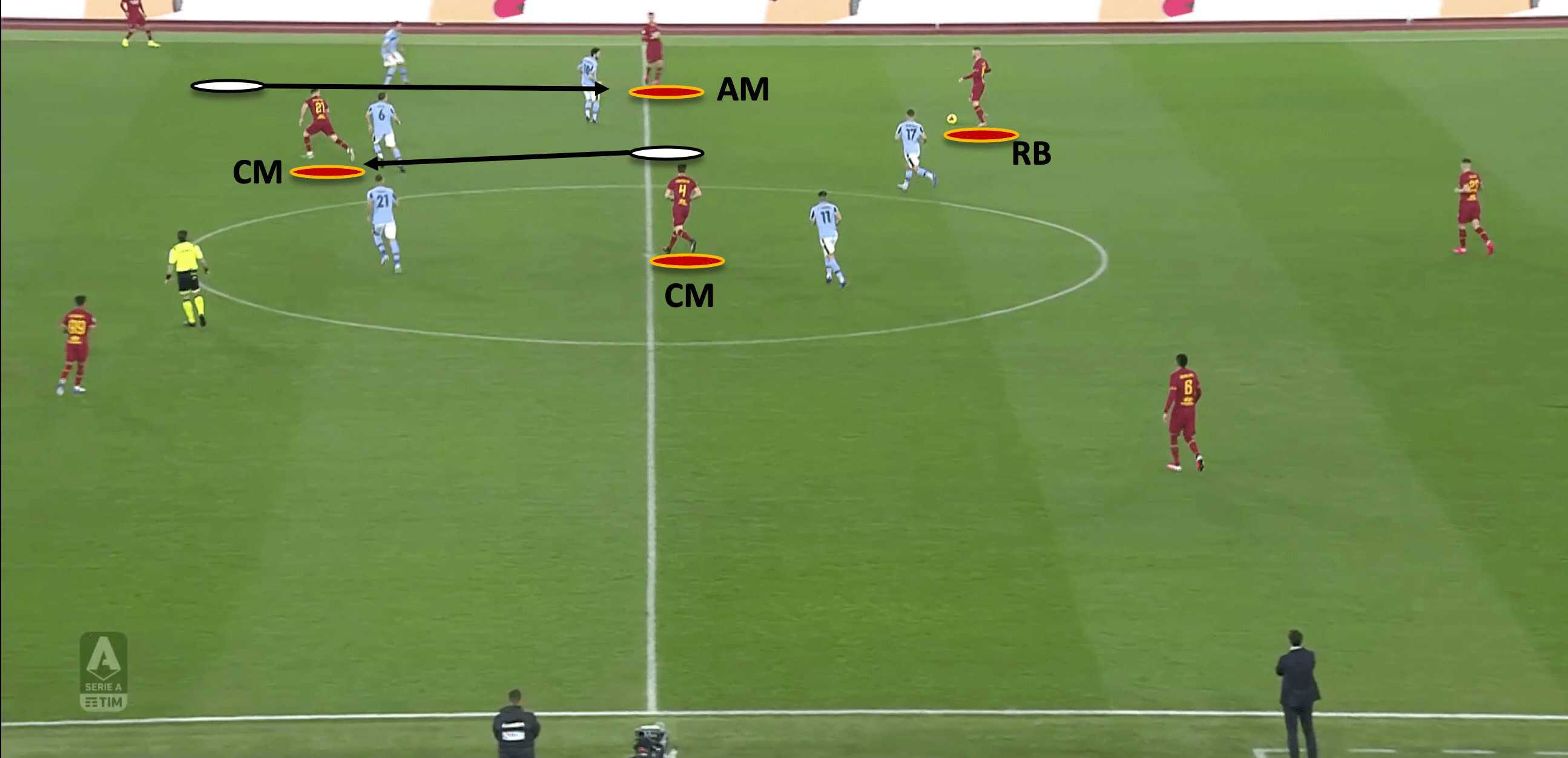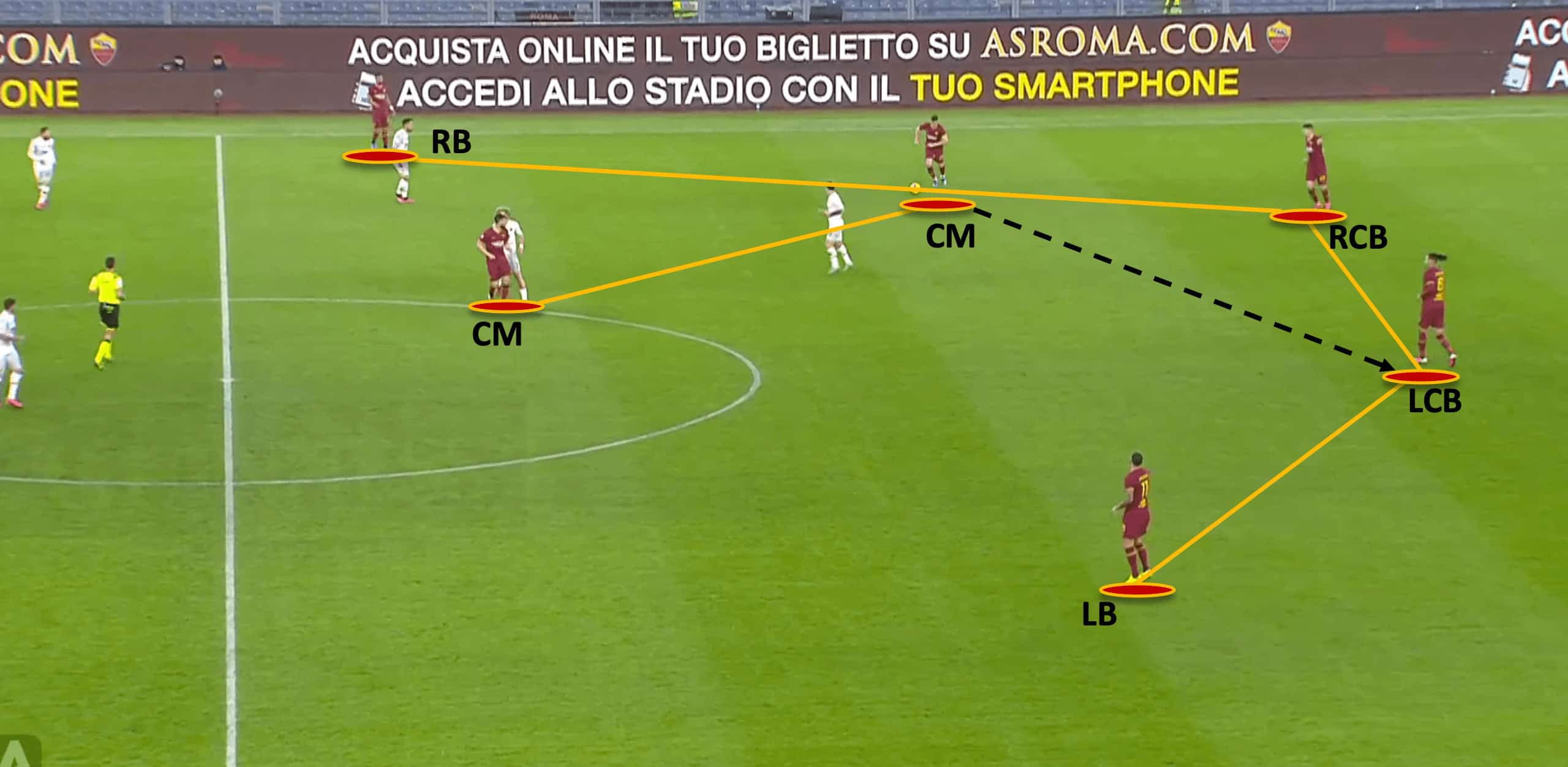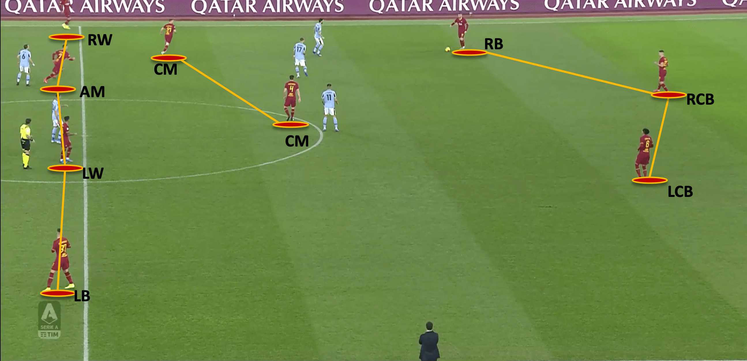 In the image shown above, we can see Roma’s 3-2-4-1 shape in the build-up. Regardless of how it is formed, it shares the main principles of the shape which are: