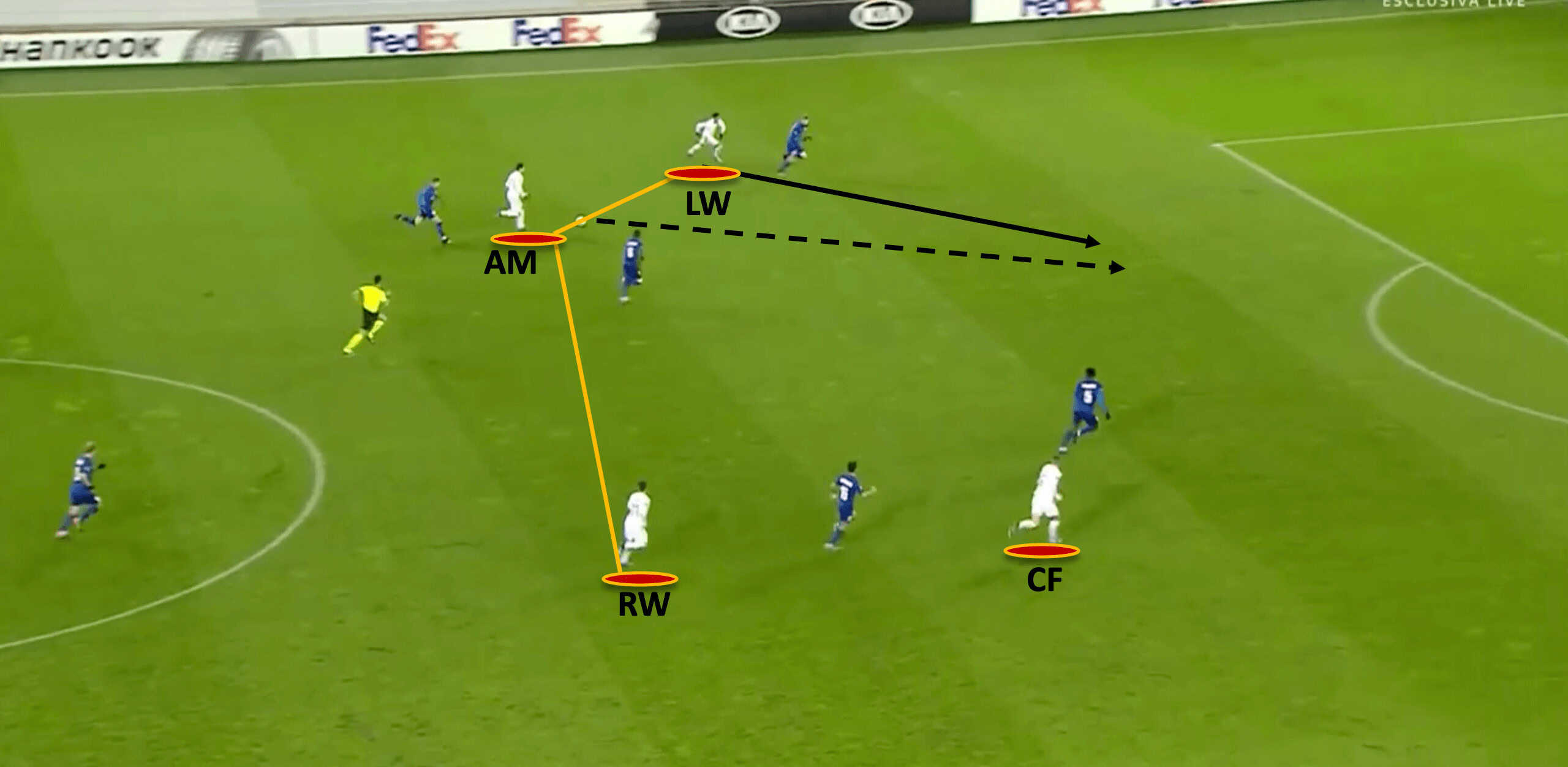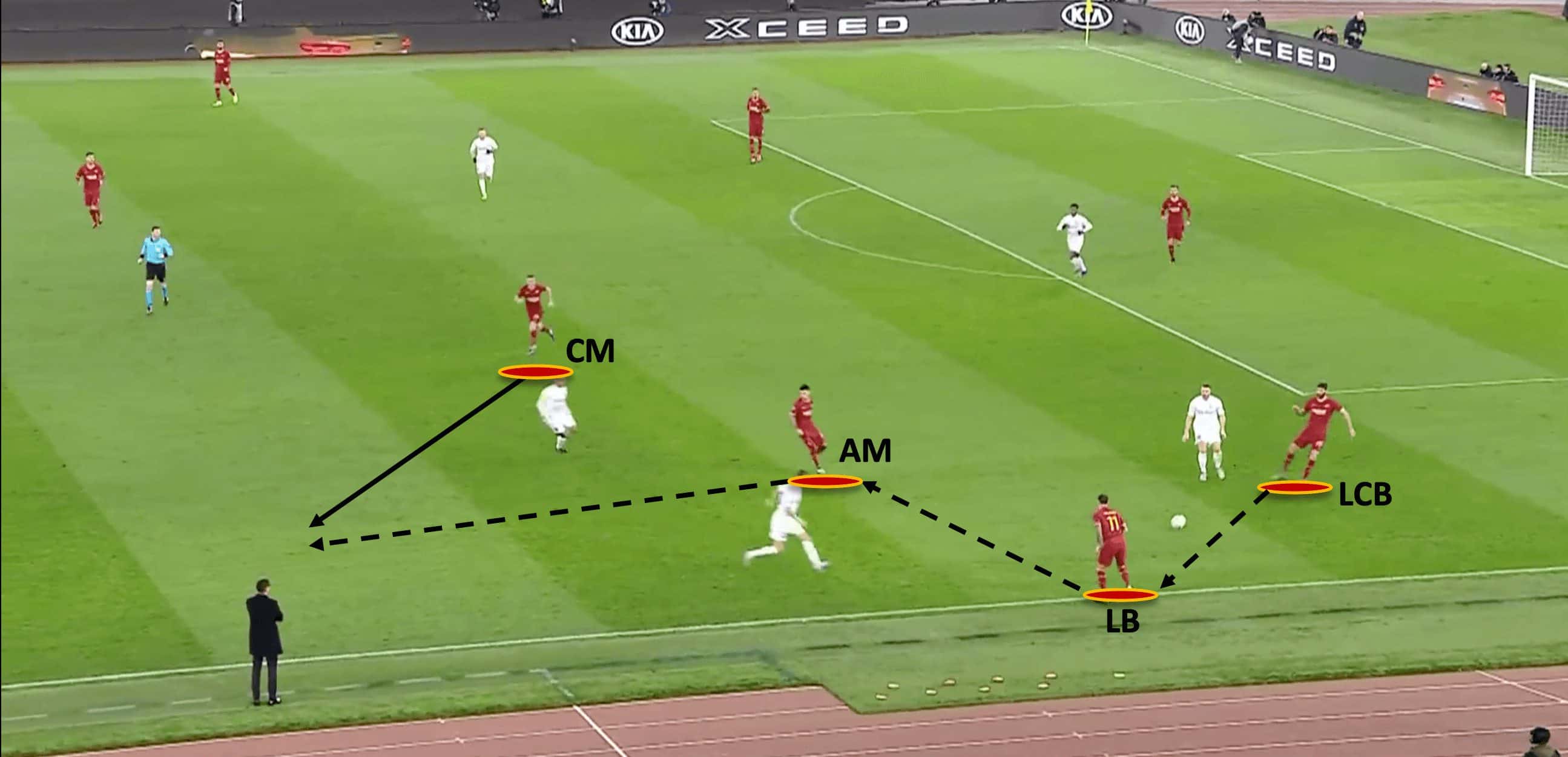 In this case, Roma are using the first variation of the 3-2-4-1, the attacking midfielder, left centreback and left-back have created a triangle. Gent have 3 players within the triangle, so Roma use the central midfielder to create an overload by having him make a run to the touchline.