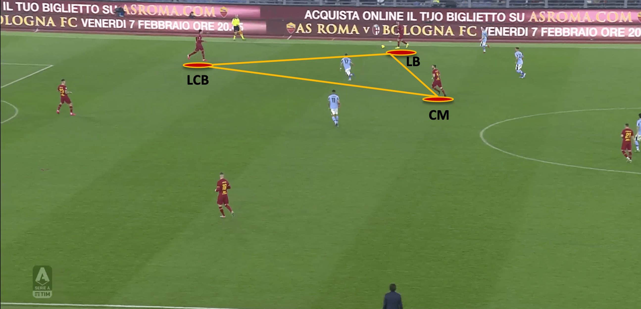 Due to the near-permanent occupation of the halfspaces and wings – especially on the near side – Roma find it easy to play through the opponent’s press in these areas, and most of their play utilises width, with 70% of Roma’s attacks coming down either wing. Paulo Fonseca at Roma 2019/20 - tactical analysis tacticsThe back three shape allows the wide centre backs to interact in the halfspaces and wings with less risk in transition. Using the centre backs in wide areas help Roma create triangles out wide, with the players that create these triangles changing depending on how far advanced the attack is. The wide centre back will form the base of the triangle if he is within range, alongside the near side pivot and wide player. If the centre back is too far, the near side pivot, wide player, and whoever is occupying the halfspace will create the triangle. In the images shown below, we can see two examples of this triangle, with the centre back, left-back, and near side central midfielder creating it.Paulo Fonseca at Roma 2019/20 - tactical analysis tactics