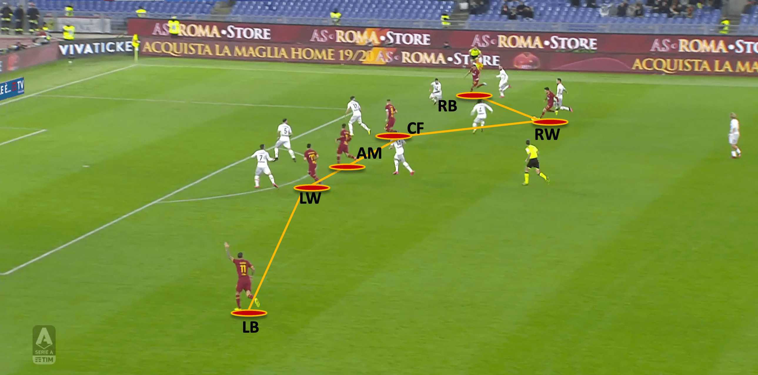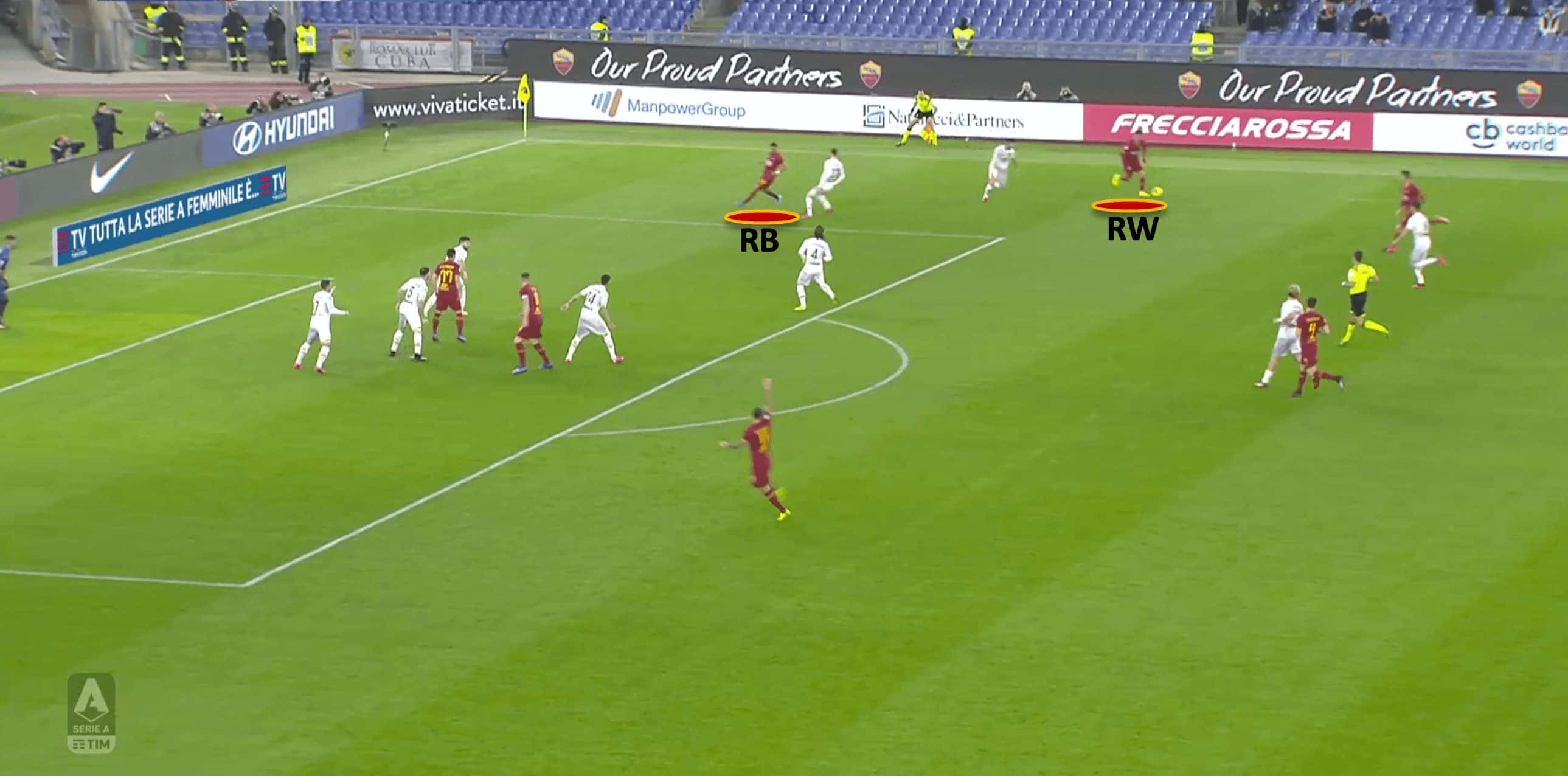 Having so many players across the forward line allows Roma to occupy all 5 vertical corridors (both halfspaces, both wings, and the centre). Due to their preference of attacking using width, the opponent will be dragged across to one side, giving players on the far side space to receive the ball.