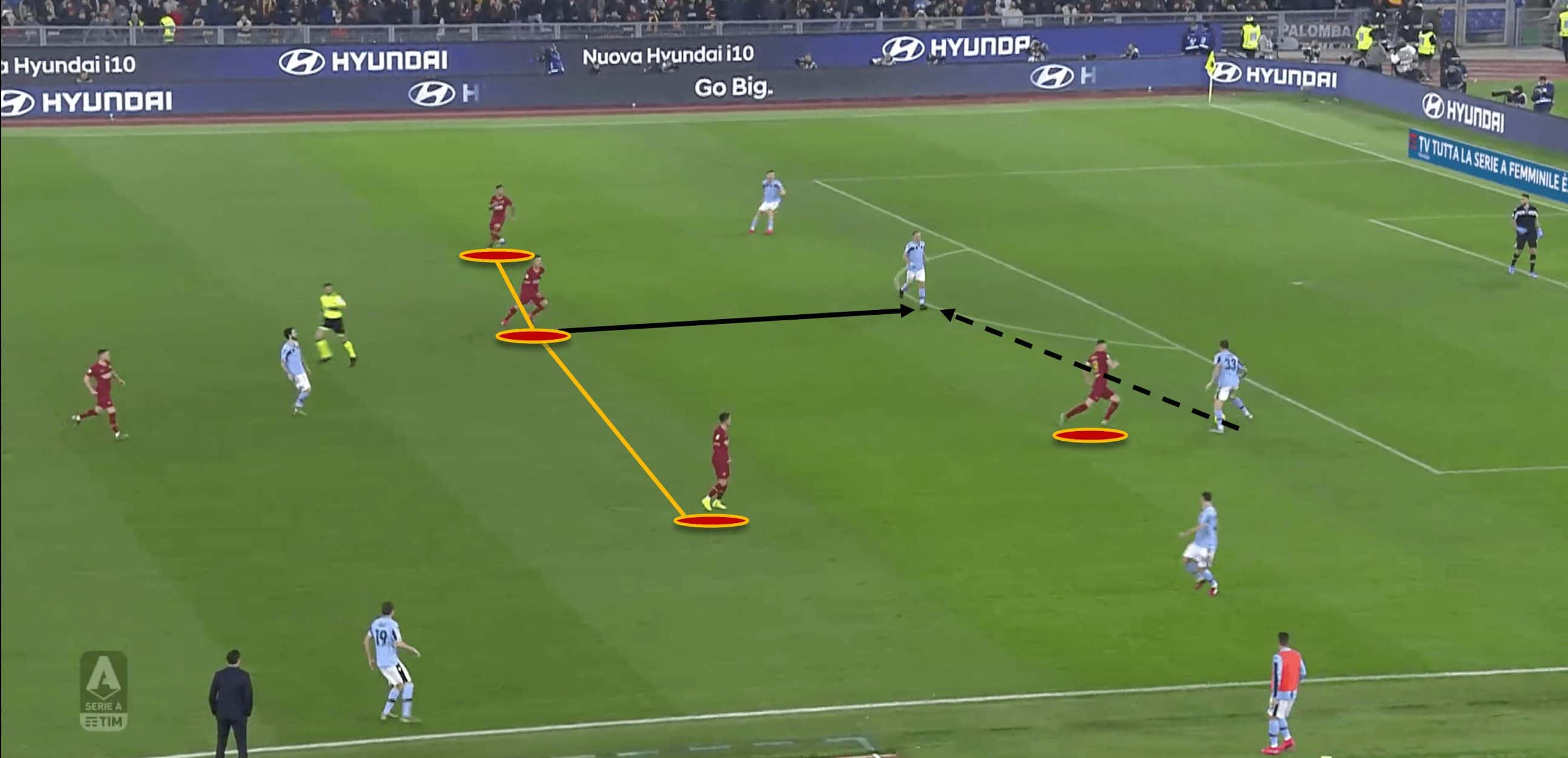 Below, we can see an example of this. Roma were in their 4-2-3-1 shape, and the attacking midfielder stepped out as the ball was in motion after a pass from a centre back to the fullback. Then, the winger has already jumped out to apply pressure as the ball reaches the fullback.