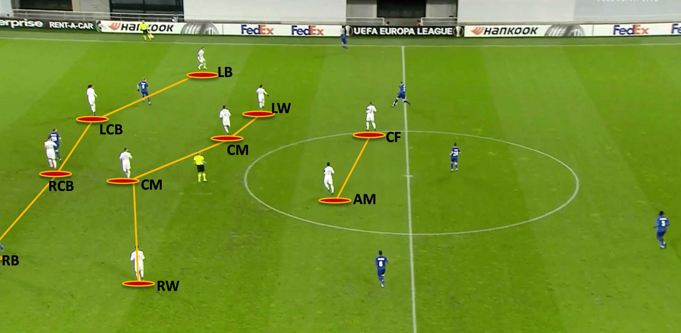 Once again we can see the same principles in action, this time in the 4-4-2 shape. The block is compact horizontally and vertically, the space into the centre of the pitch is being blocked off intelligently, and we can see the zonal structure as well.