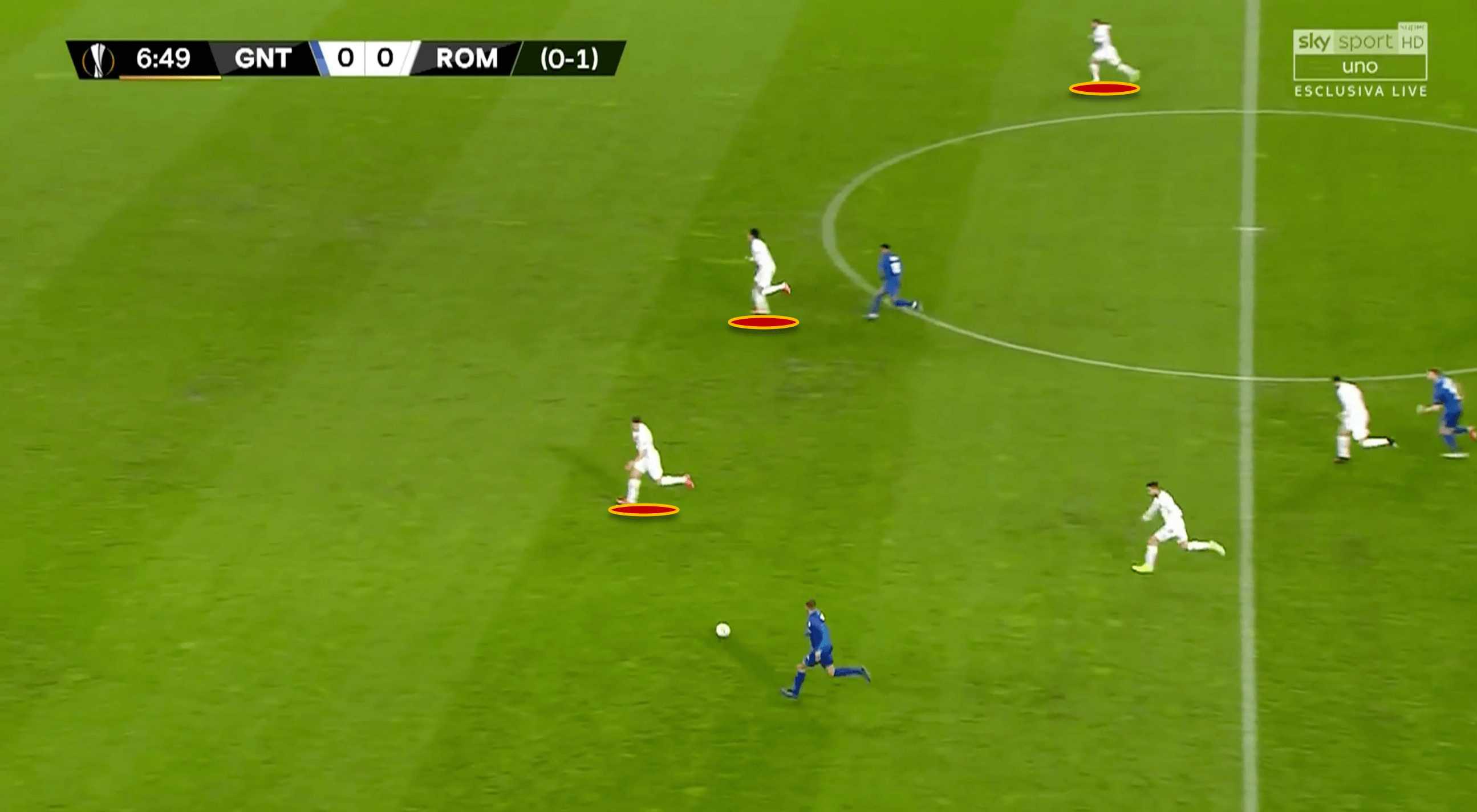 Fonseca is a pragmatic coach, so, unlike many coaches, he does not always commit to one single defensive style and tactics. Roma’s urgency when out of possession is dependant on a multitude of factors, such as the scoreline and the opponent. For example, in the first leg of the Europa League round of 16 against Gent, Roma had a PPDA (opposition passes allowed per defensive action) of 23.74 (an extremely passive press), while in their next match against Lecce their PPDA was 9.32 (a much more aggressive press).