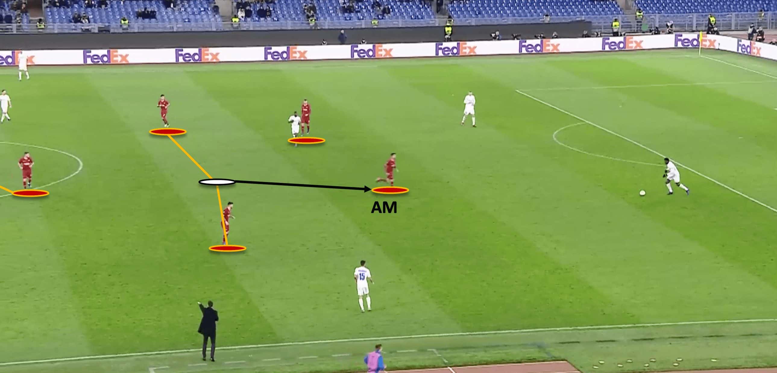 The attacking midfielder will also step out to press when the opposing player has too much time or space on the ball as seen in the image shown below. The attacking midfielder has stepped out as the opposing centre back has too much space.