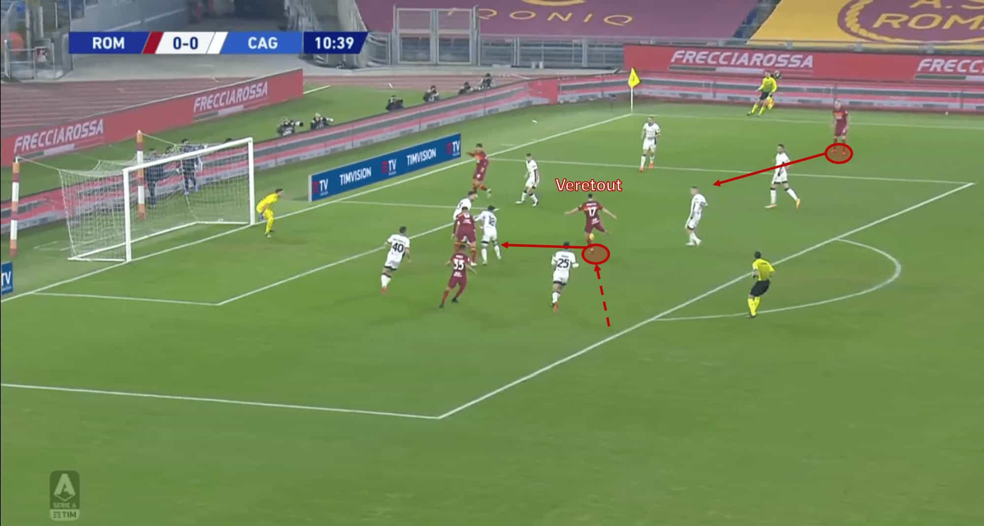 Running from left to right, Veretout blindsides the Cagliari defence after a deflected cross from the right-wing.