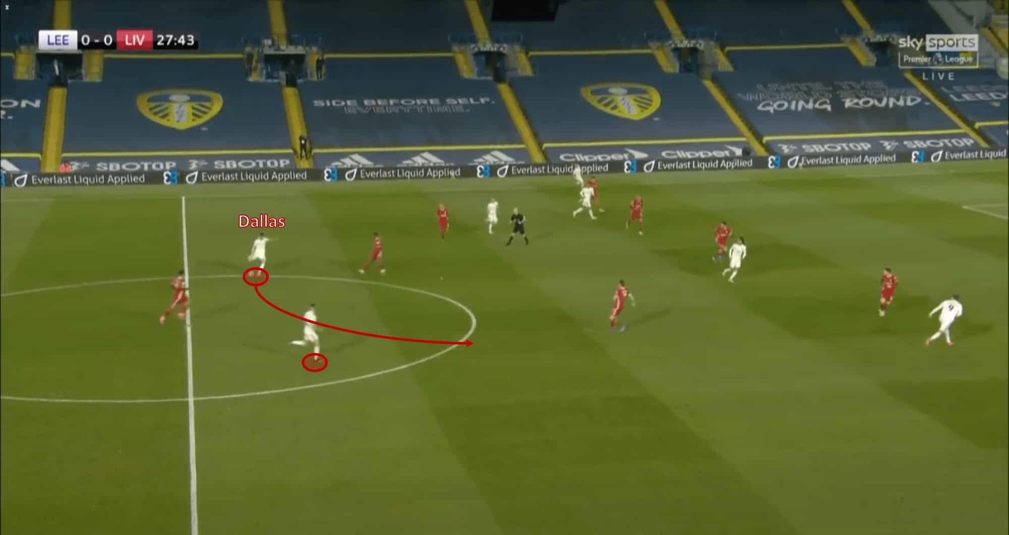 Dallas here receives the ball deep in the build-up and plays the rangy pass out towards the right-wing.