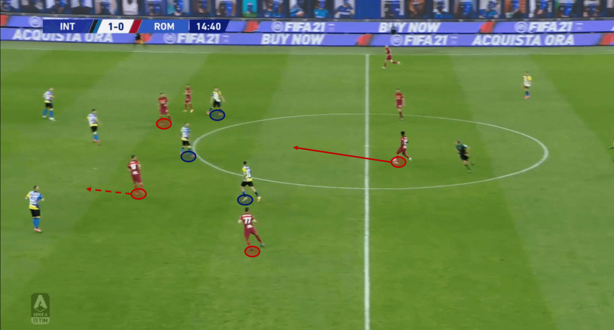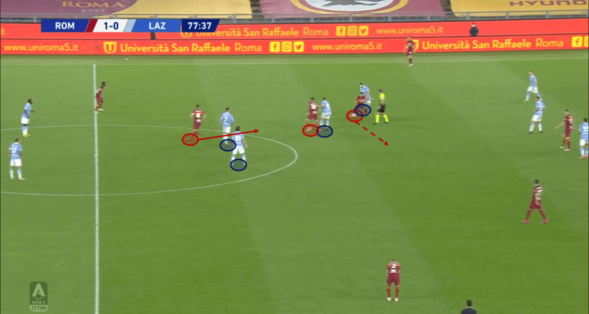 Fonseca favours short passing out of defence, with midfield players positioning themselves in between the lines to receive the ball and aid ball progression. Similarly, to Bielsa’s Leeds, Roma have not tended to pass long and direct, despite having a physically imposing focal point in the form of Edin Džeko. If they do pass long, it is usually to exploit the high line of the better sides in the division.