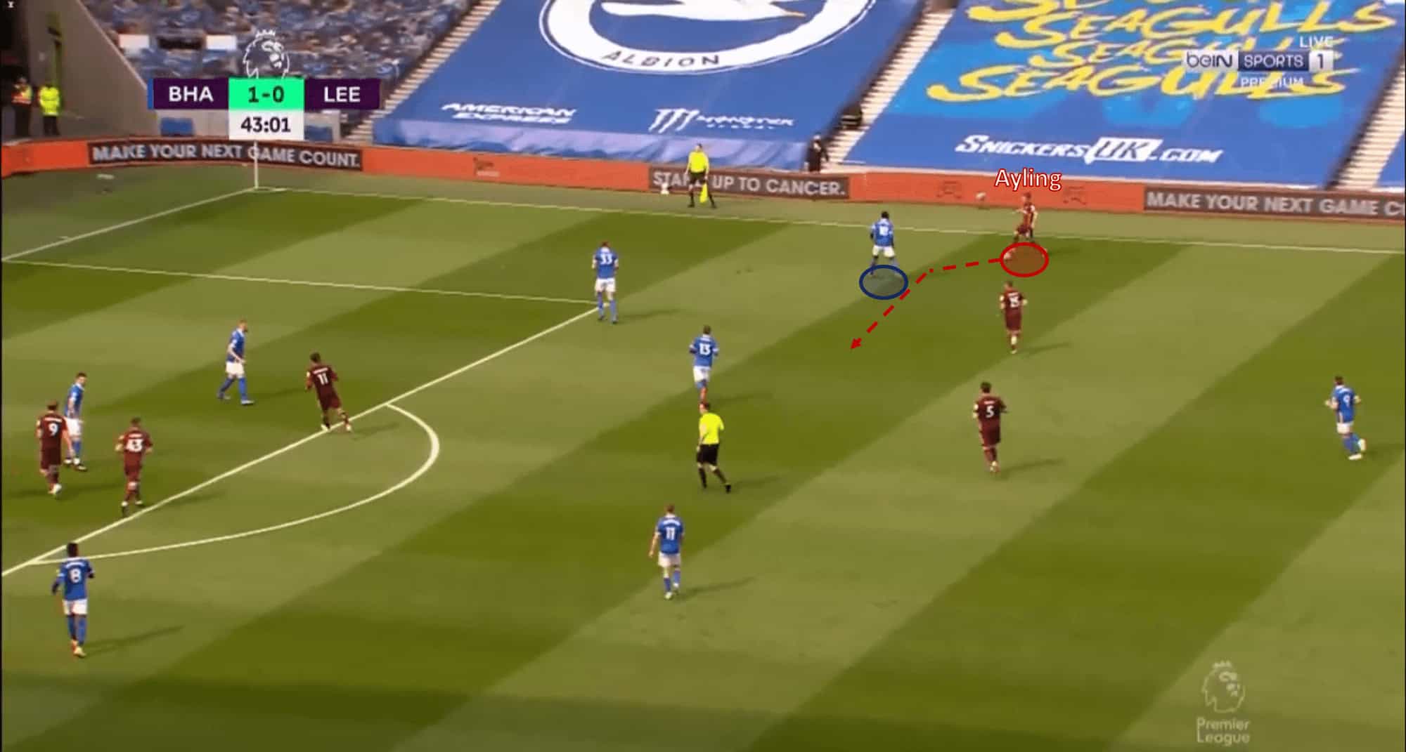 Ayling high up the pitch is preparing to take on Bissouma 1v1, driving inside to force an attack for Leeds.