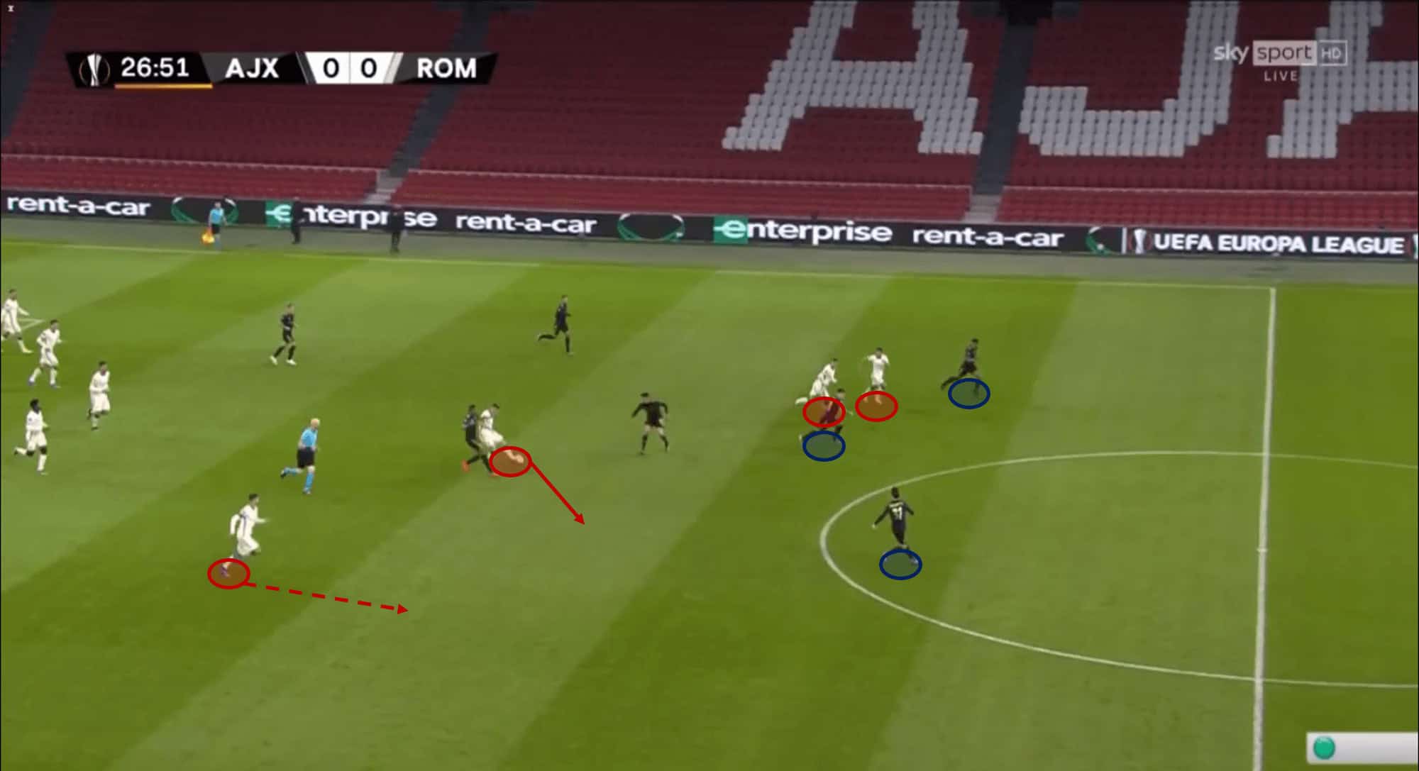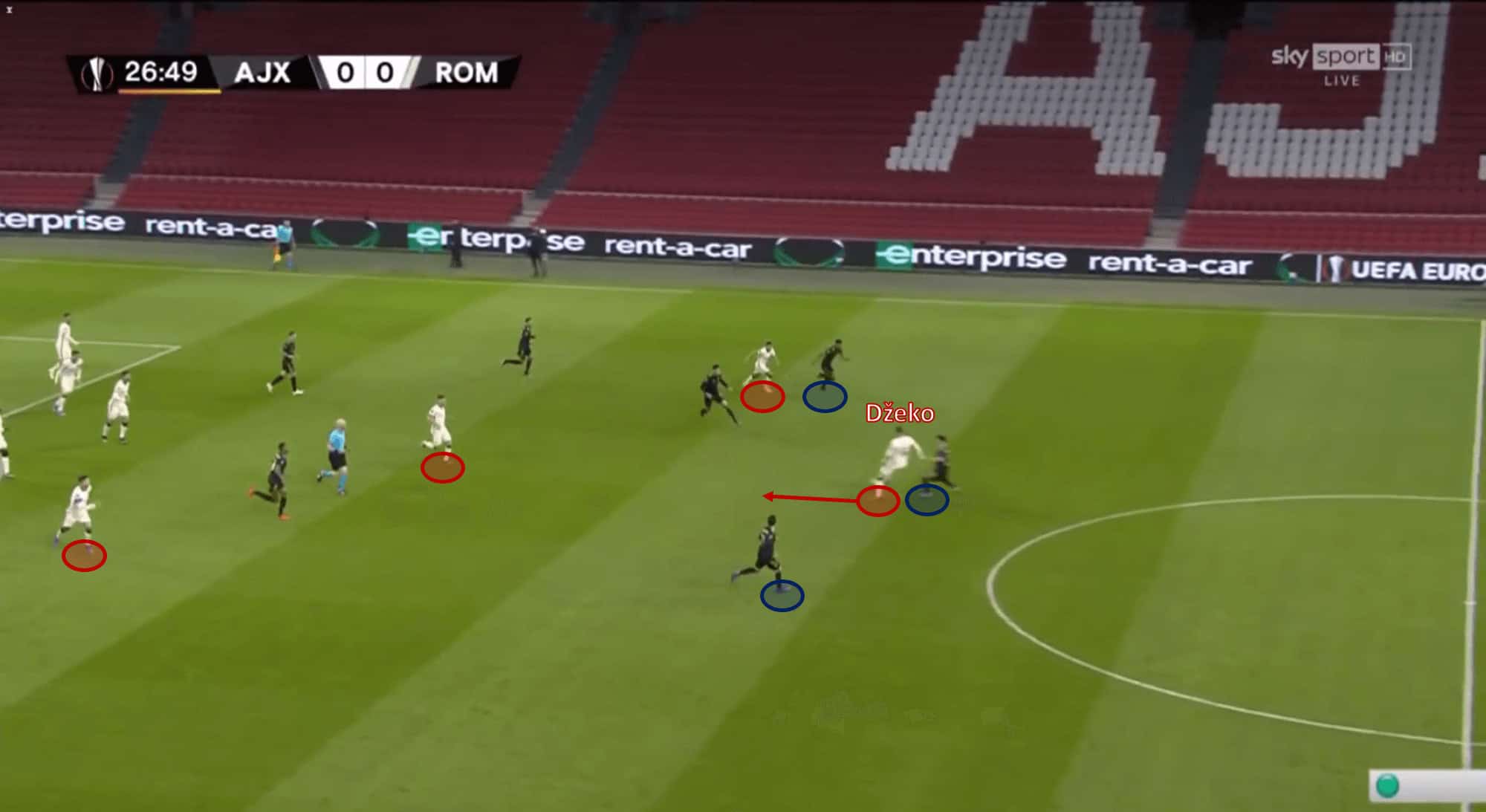 With Roma players hitting Ajax on the break, Džeko spins his man and acts as another runner.