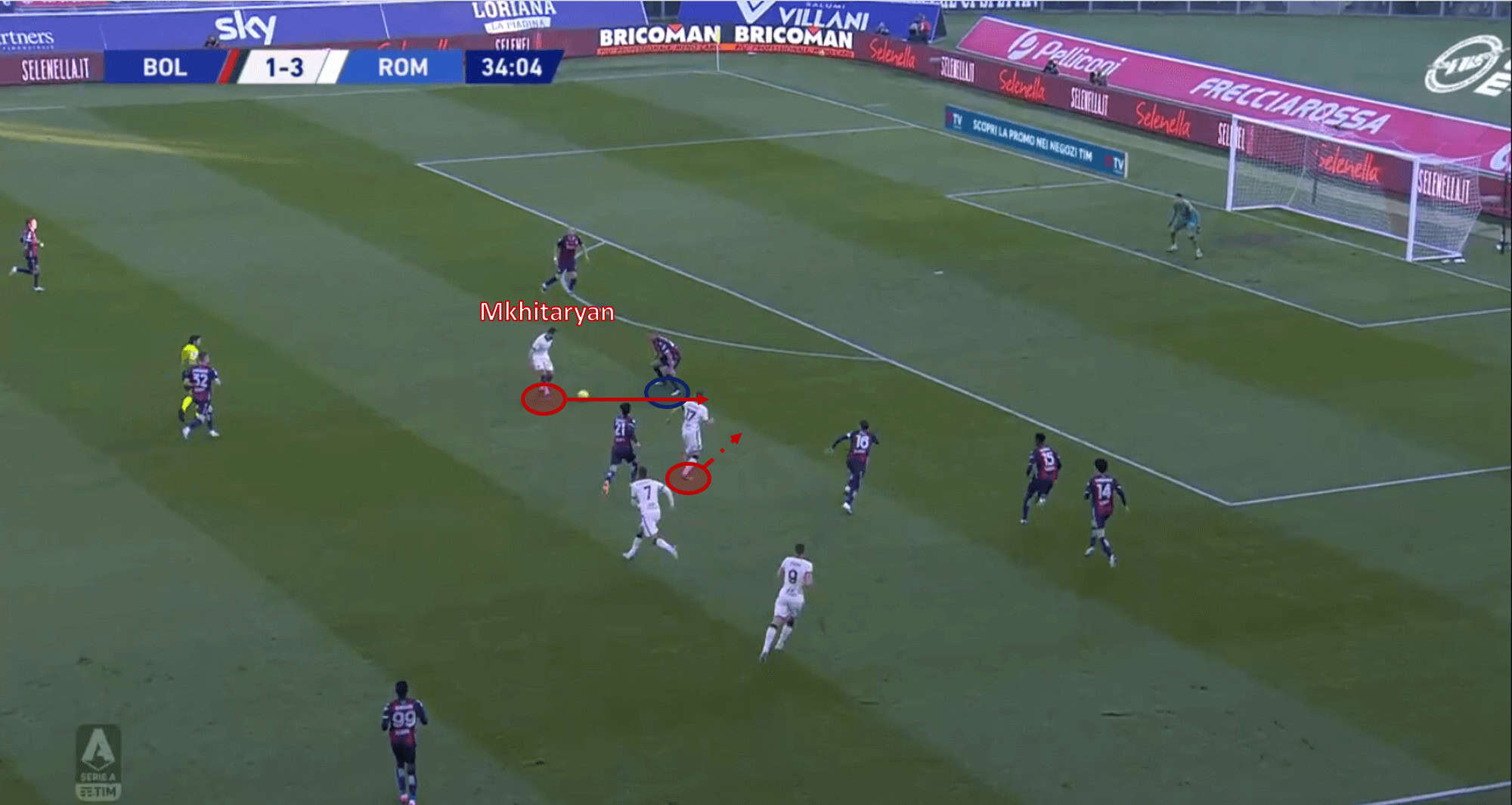 Mkhitaryan places himself in a central position to play the through pass, penetrating the Bologna defence.