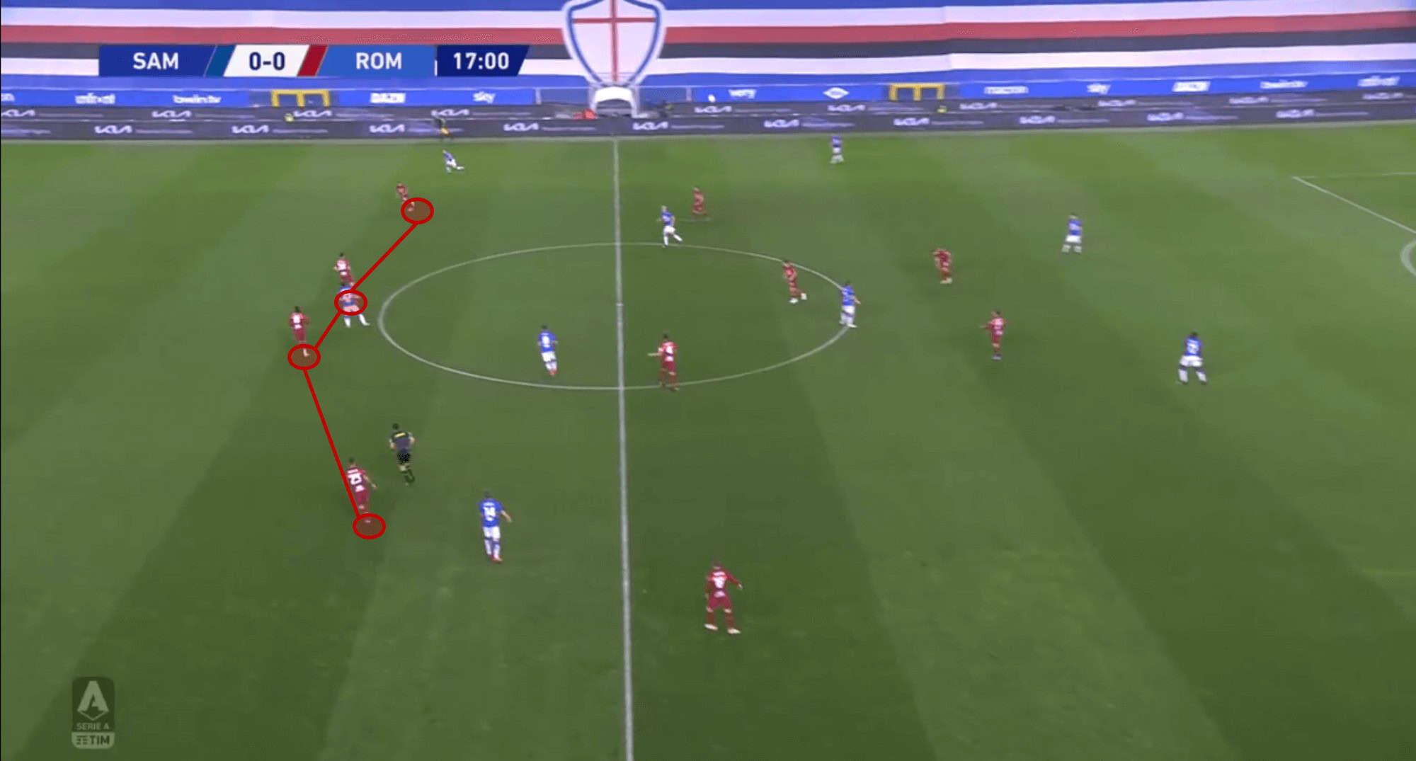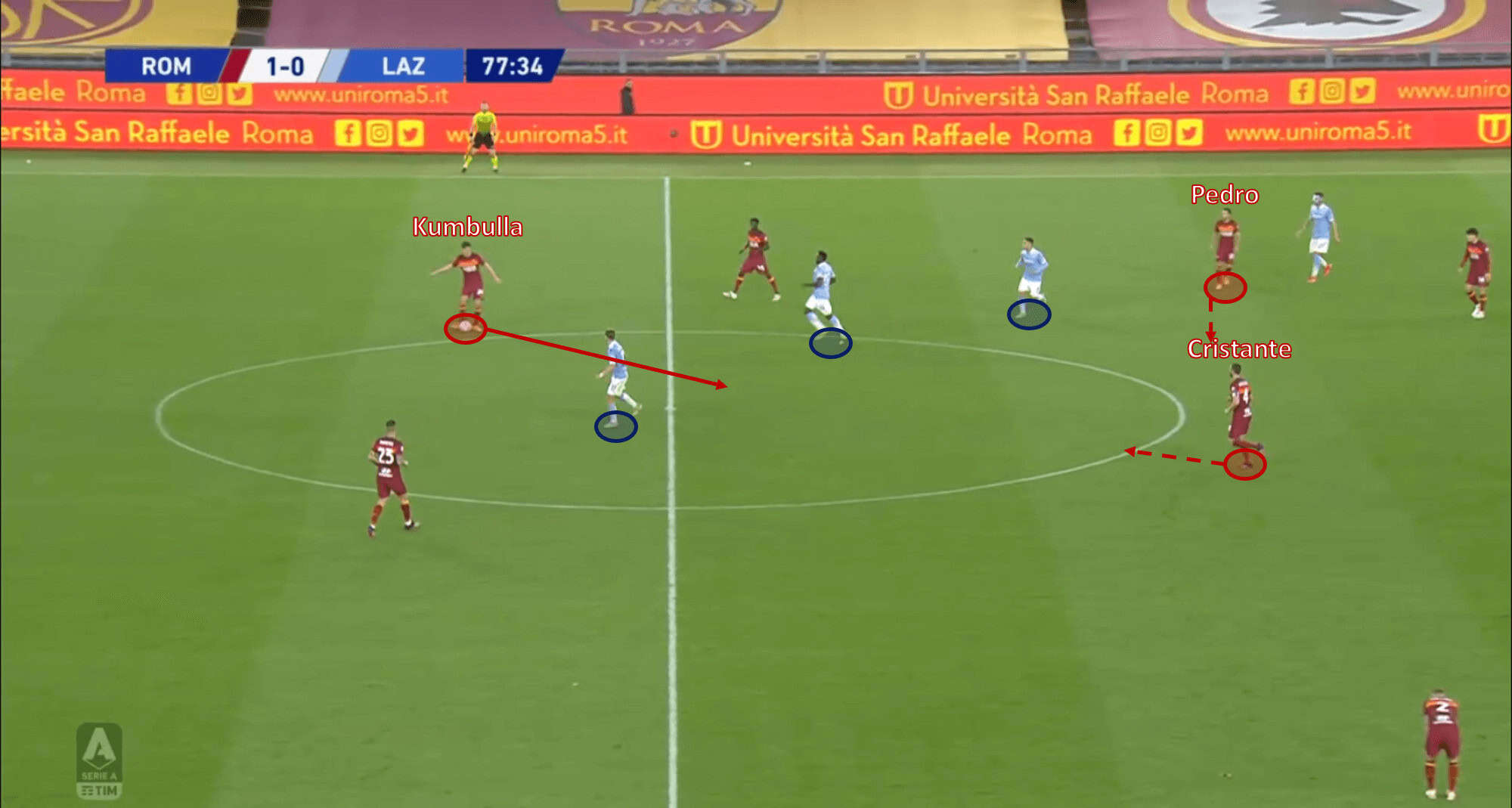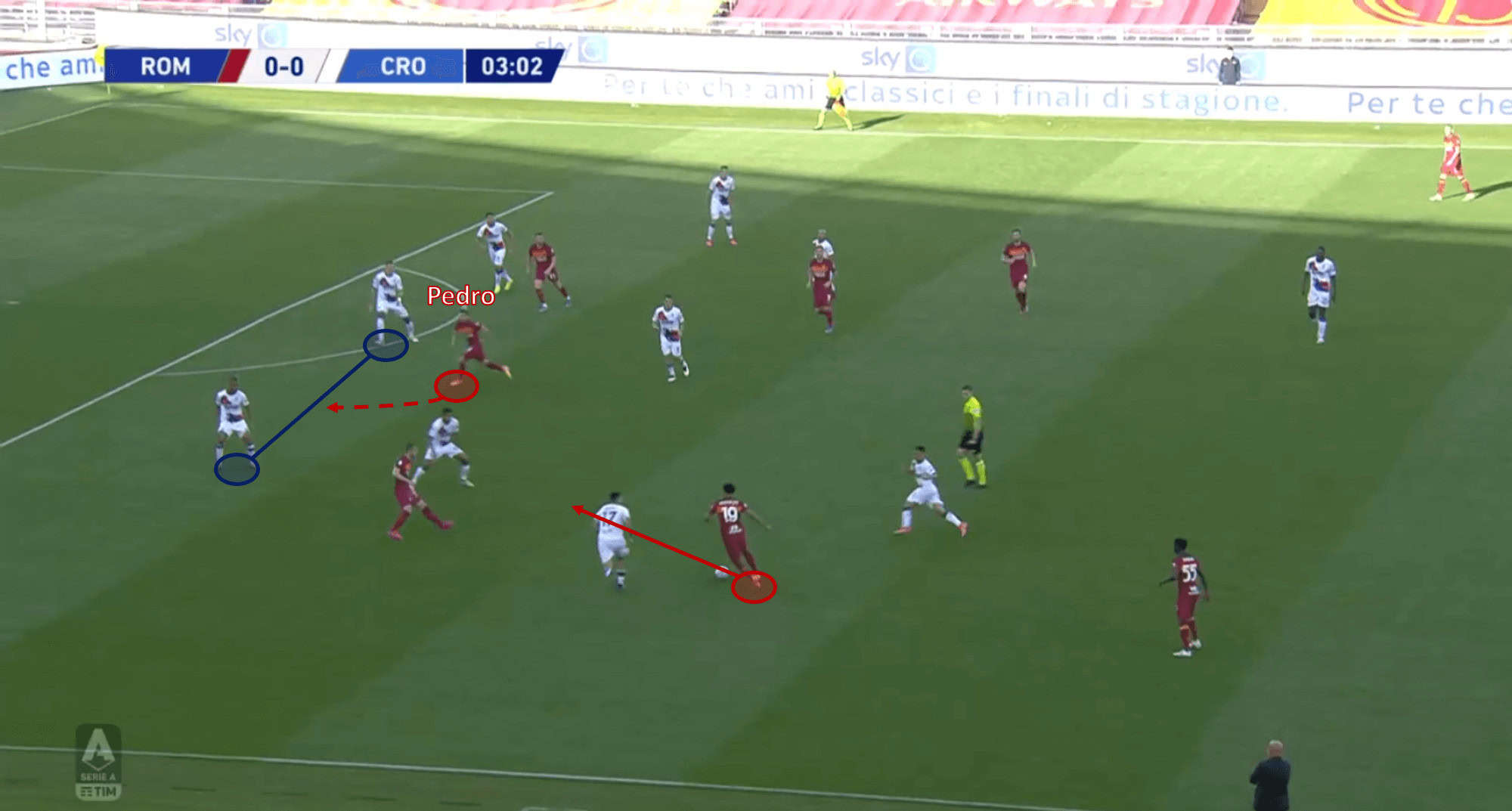 Down the central channel, Kumbulla plays the progressive pass into Cristante while Pedro moves infield.