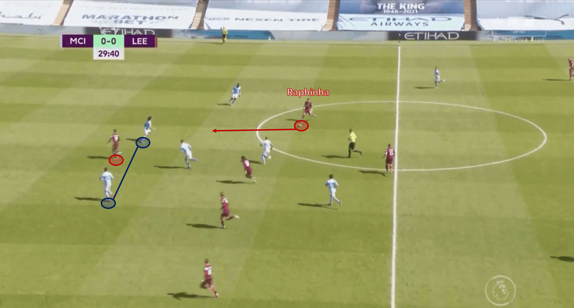 Raphinha here in a central area – which is rare it must be said – spots Roberts run a touch too late as he is offside, but the vision to spot the run is there.