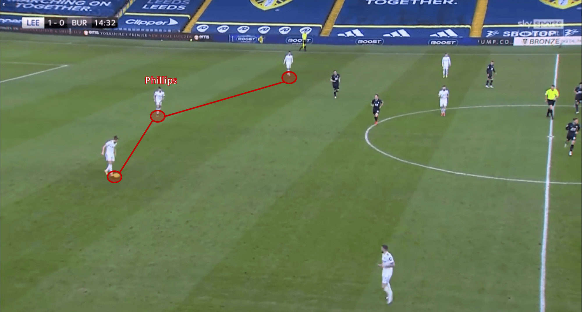 Sitting in front of the back three, Phillips distributes out wide-left to Harrison making a run beyond the defensive line.