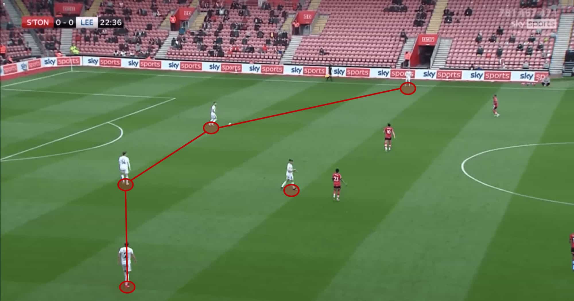 Bielsa’s back four can transition into a back three swiftly if Ayling drops slightly deeper and allows Alioski on the other side to push forward.