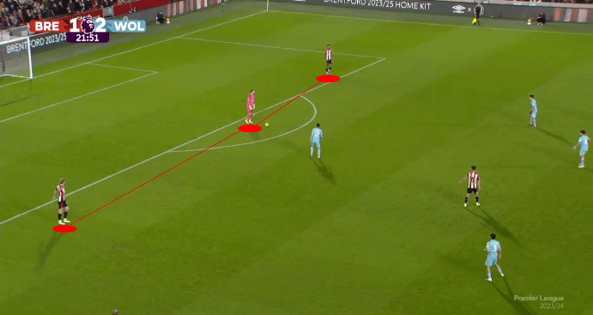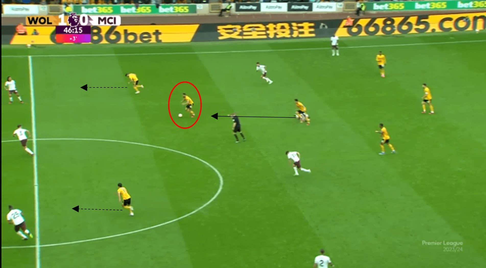 The above image illustrates how compact Wolves are when out of possession, with six Wolves players congested on the left side of the pitch.