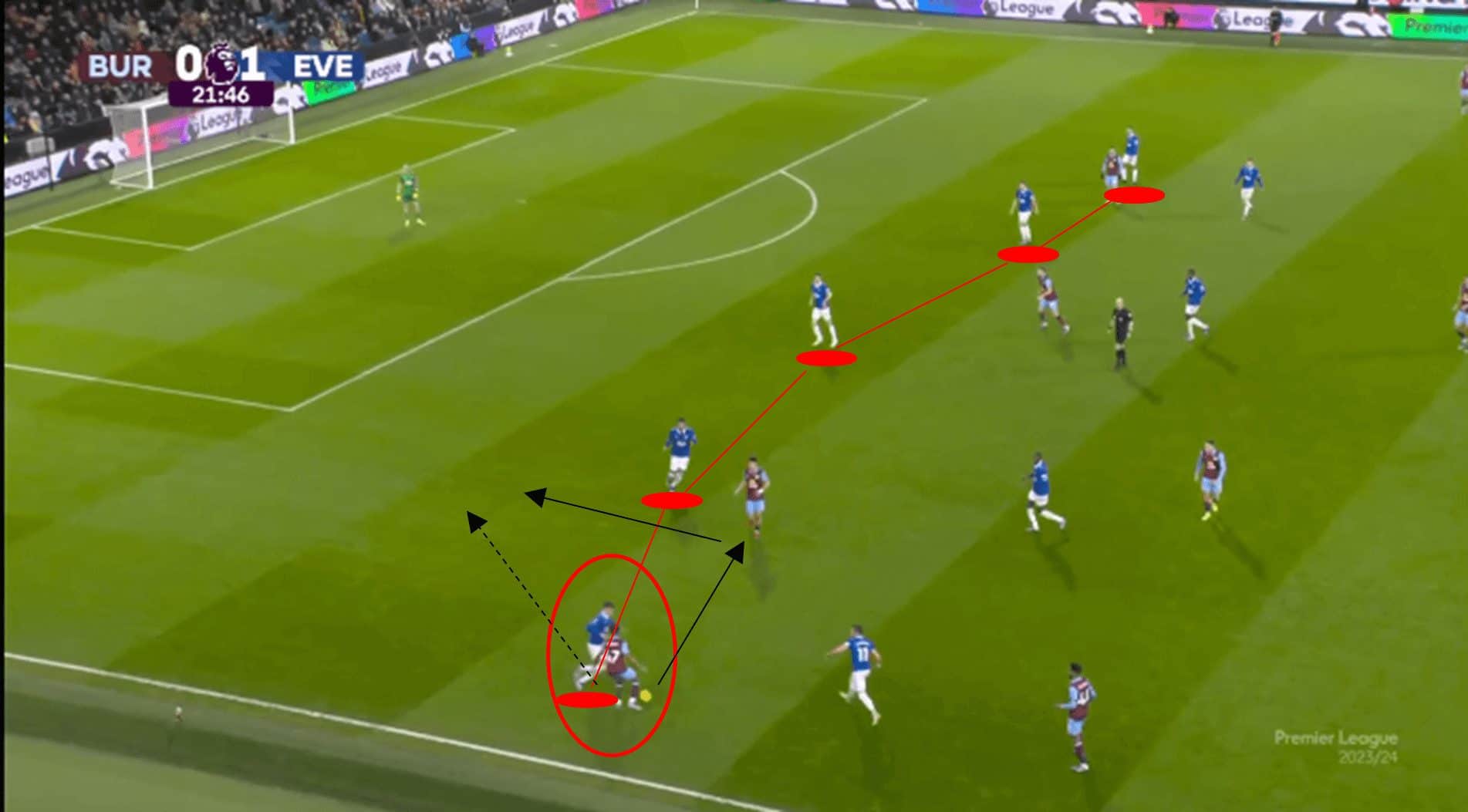 However, as the cross reaches Jay Rodriguez, Everton has strength in numbers with the remainder of the back five, and the ball is eventually blocked and cleared.