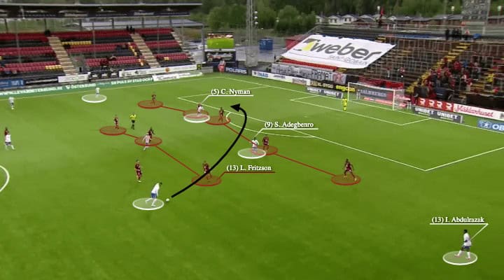 Then, Wahlqvist made good use of that area vacated by Adegbenro. As Fritzson was late to press, he was unable to block the angle of the long pass, which came from a slightly surprising angle. Then, Christoffer Nyman just sneaked into that gap to attack the blindside of the centre-back, guided the ball into the net with a classy header.