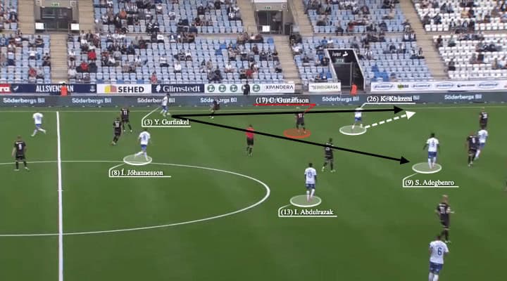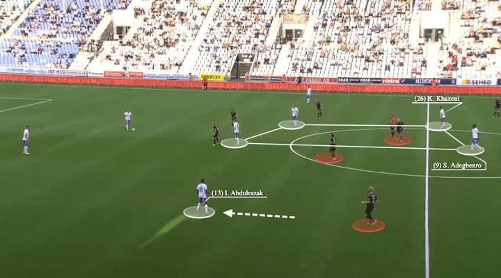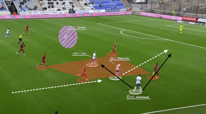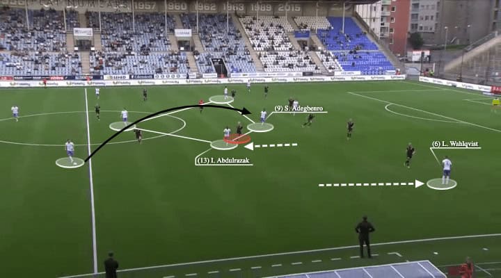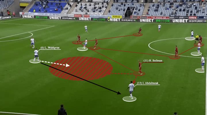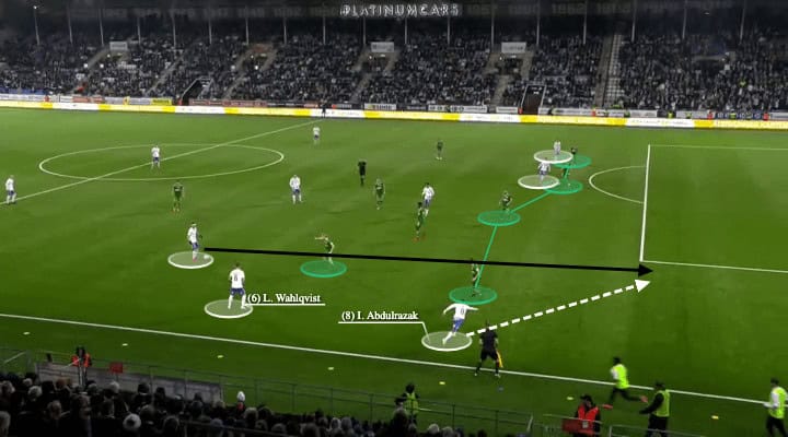 Alternatively, if Abdulrazak’s relatively wide position pulled Bellman away from the half-spaces, Wahlqvist could simply play a vertical ball to find the attacking midfielder, which was an even more direct way go forward.