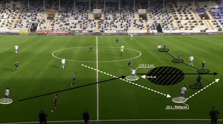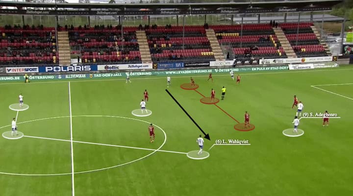 In this situation, the run was through the half-space by Wahlqvist. That sudden acceleration successfully outran the Östersunds second line. This gave Abdulrazak two options, and the solutions to counter-act. If the last line did not drop to cover the run, Wahlqvist could be found behind. Or, if the last line dropped, it opened the passing lane and space for Levi in front of the backline.