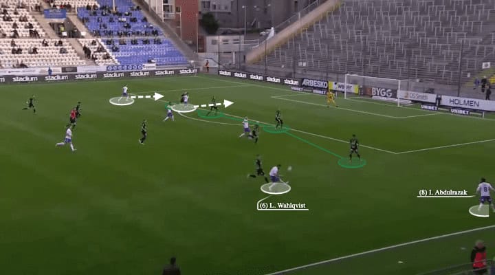 The first one was the goal against Örebro, from Abdulrazak to Levi, using the spaces created by Wahlqvist, they eventually reached the right centre-back on the right flank. Wahlqvist had great energy and pace to get behind of the left-back, and now he freed himself to cross.