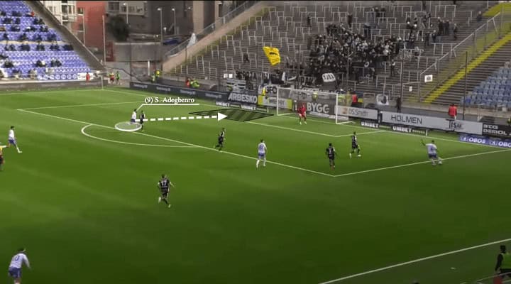 On most occasions, Nörrkoping attackers will attack the far post, and the crosses should go there as well. The strikers just had to outrun the marker as Adegbenro here, attacking the black region, and to conver the simple tap-in.