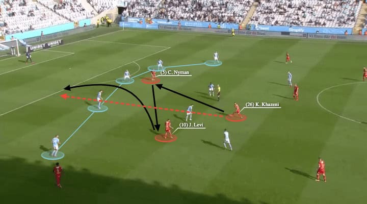 From there, the movement of Khazeni was generated two options for the ball. The move posed a question to Carl Gustafsson, if he followed the run, Gurfinkel could go diagonally into Adegebenro. Or, if he did not track the run, Khazeni will be free to pull the centre-back out.