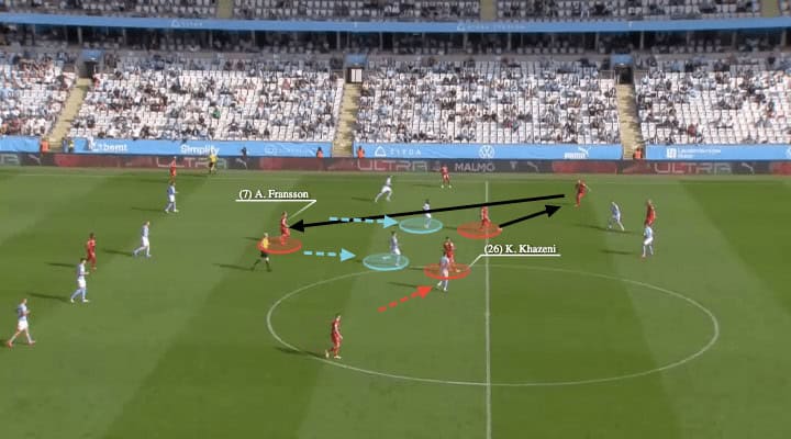 Here, with Khazeni intentionally moving into the deeper space, the two-man base of Nörrkoping dragged the two Malmö midfielders up. As a result, spaces behind the midfield were opened for Fransson to receive and turn.