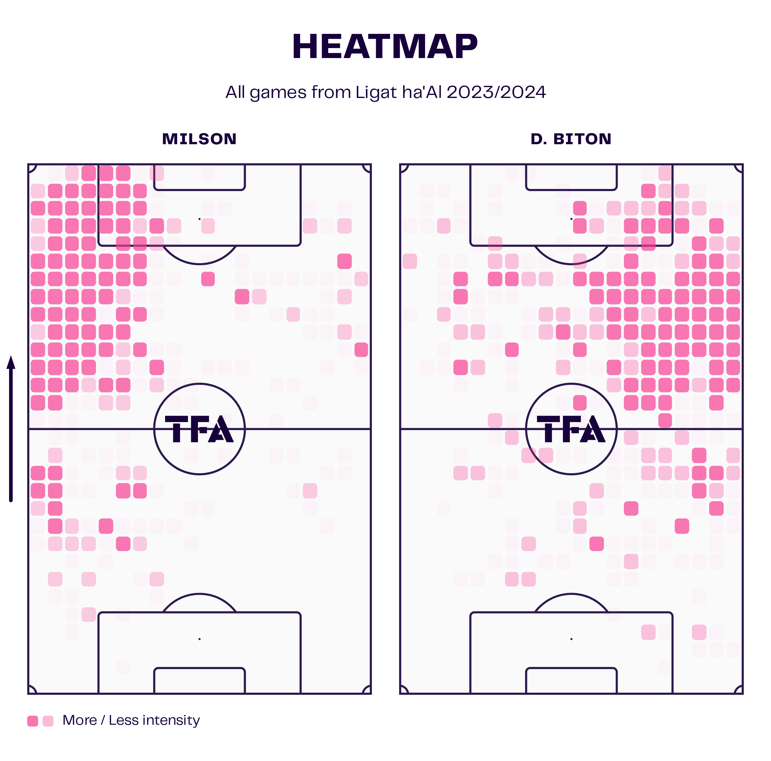 The above heatmap shows that the two Maccabi Tel Aviv players, Felício Milson and Dan Biton, who operate as the wider players of the front three, tend to feature on the channels and inside channels.