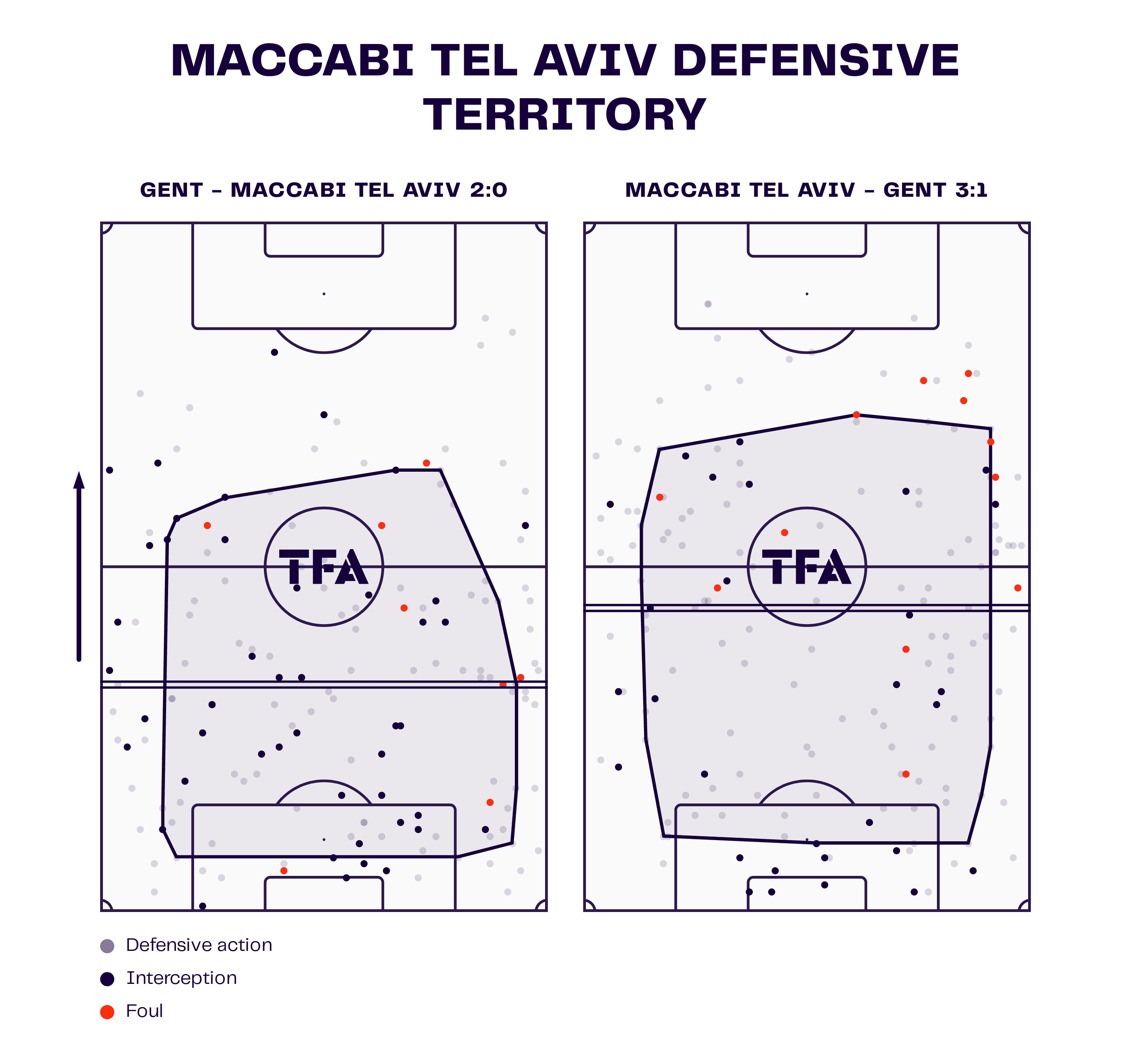 Furthermore, throughout the course of the game, Maccabi Tel Aviv adapt their out-of-possession shape.
