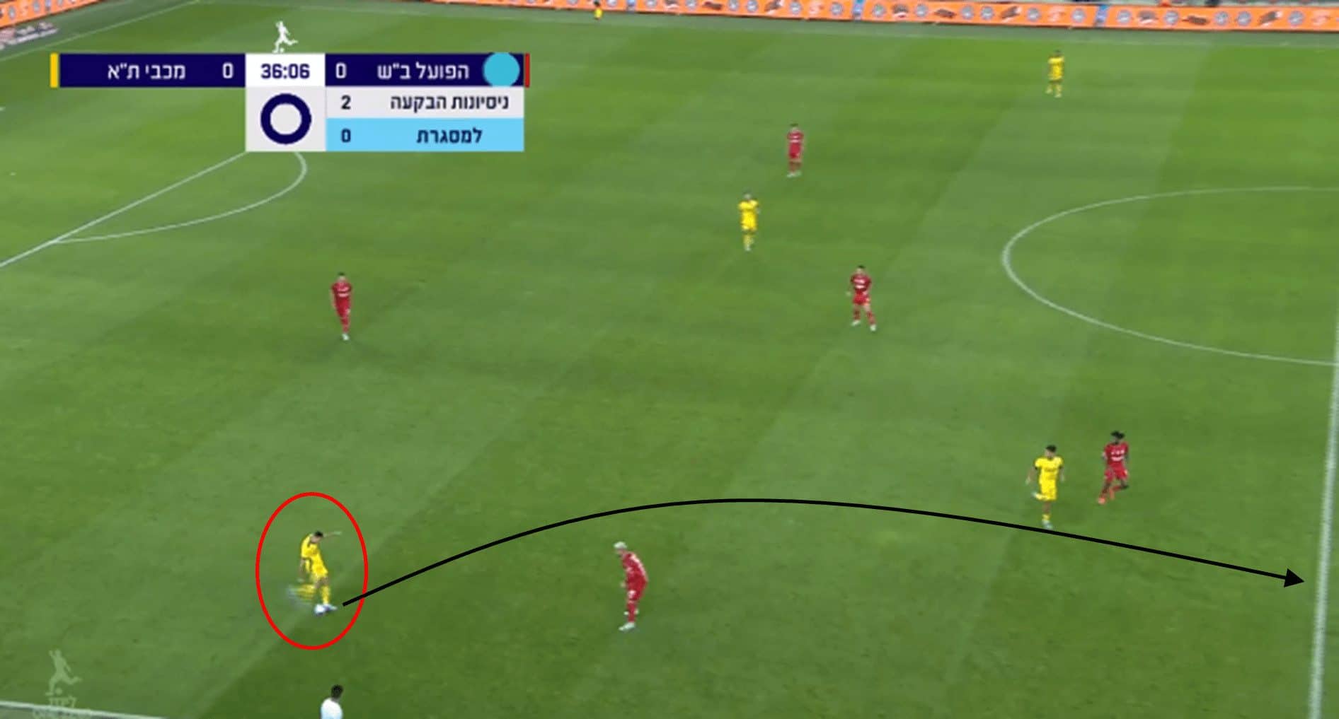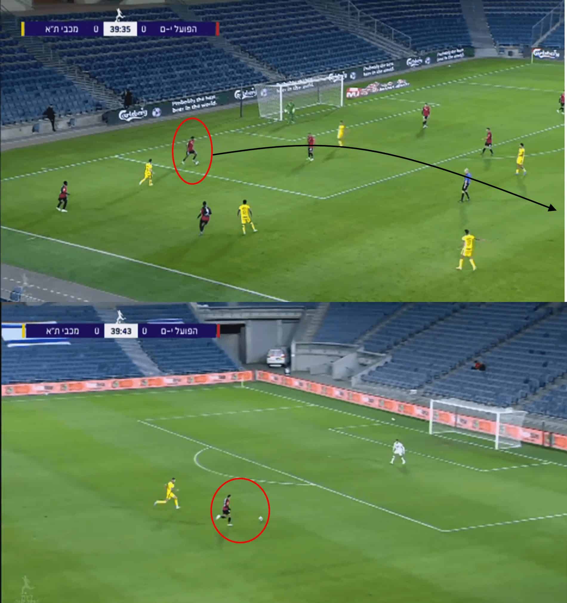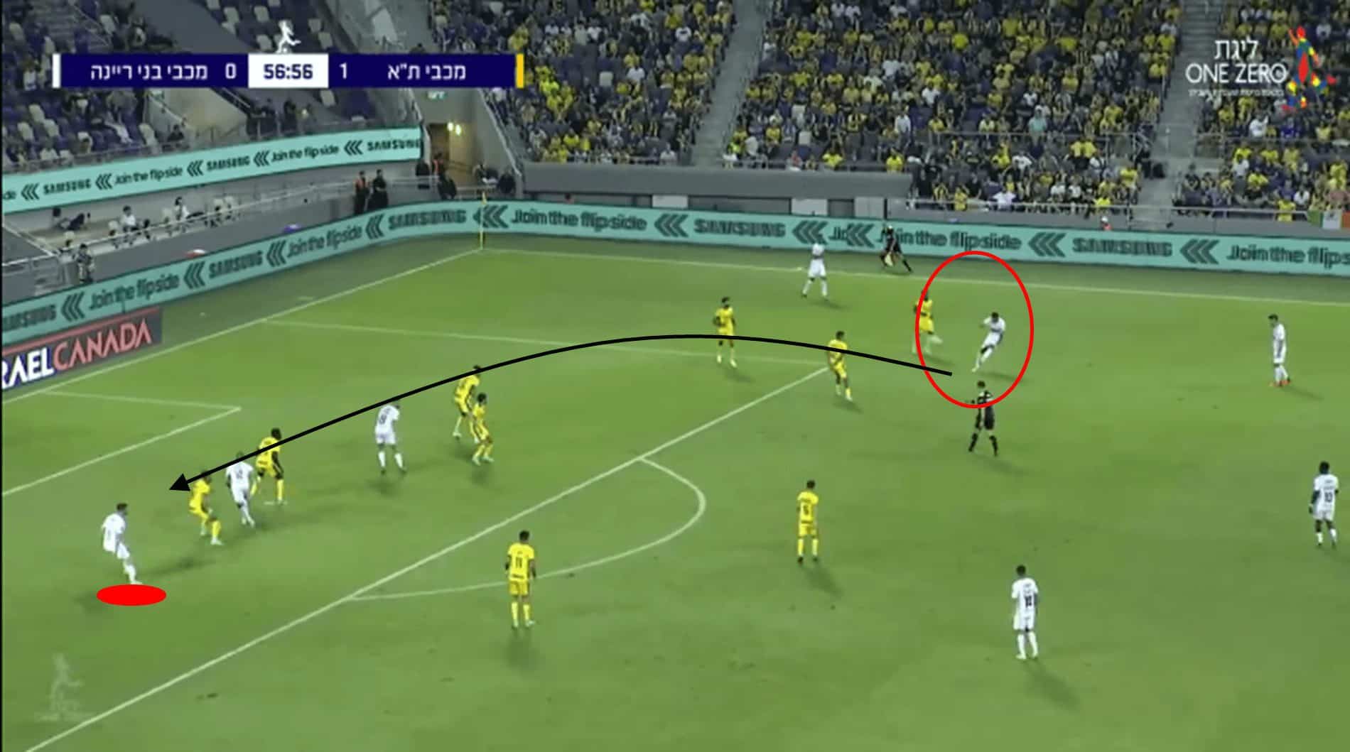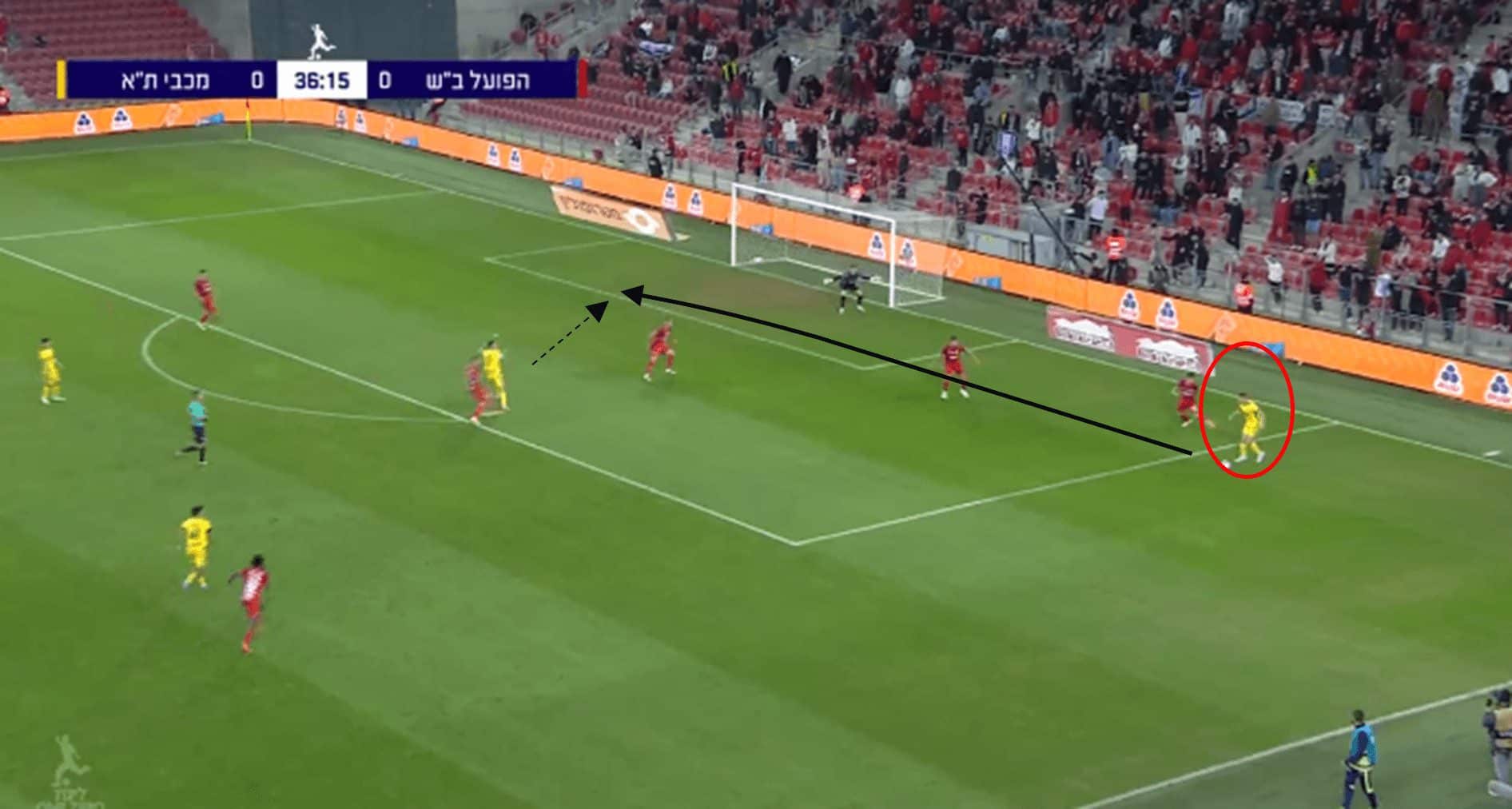 With the opposition adopting a high press, Maccabi opts for a long ball down the right-hand channel.