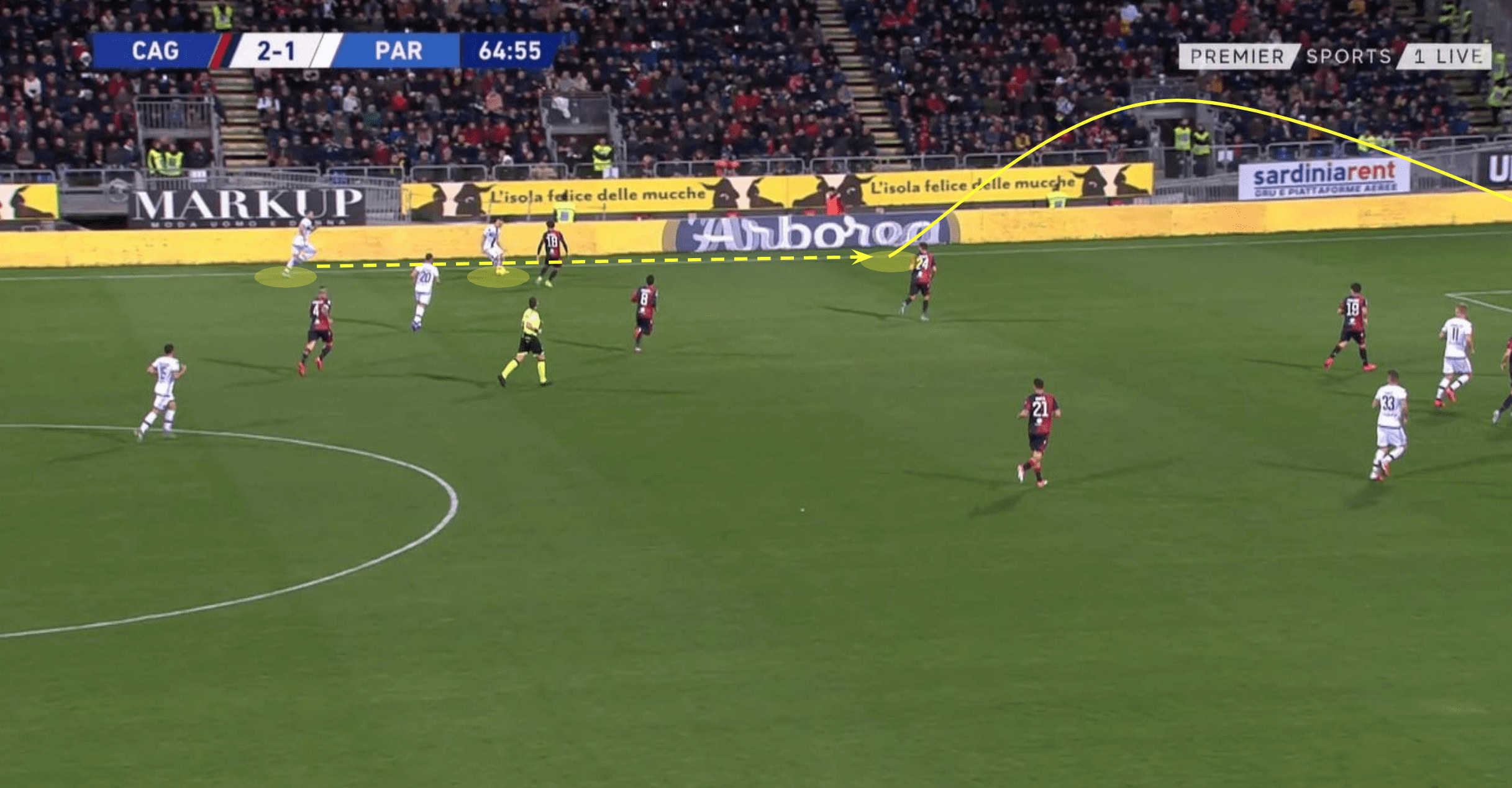 The next images shows how the initial play advanced, the threat of Kulusevski who is averaging 0.25 expected assists (xA) per 90, attracts the interest of the Cagliari press, as they look to block the wide forward from progressing into the attacking third through his direct play. This allows space for the wing-back to attack by overlapping Kulusevski, progressing play into the attacking third where Parma can look to aim a cross towards their towering forward Andreas Cornelius, who leads Serie A in relation to successful aerial duels per 90 minutes with a figure of 5.29.