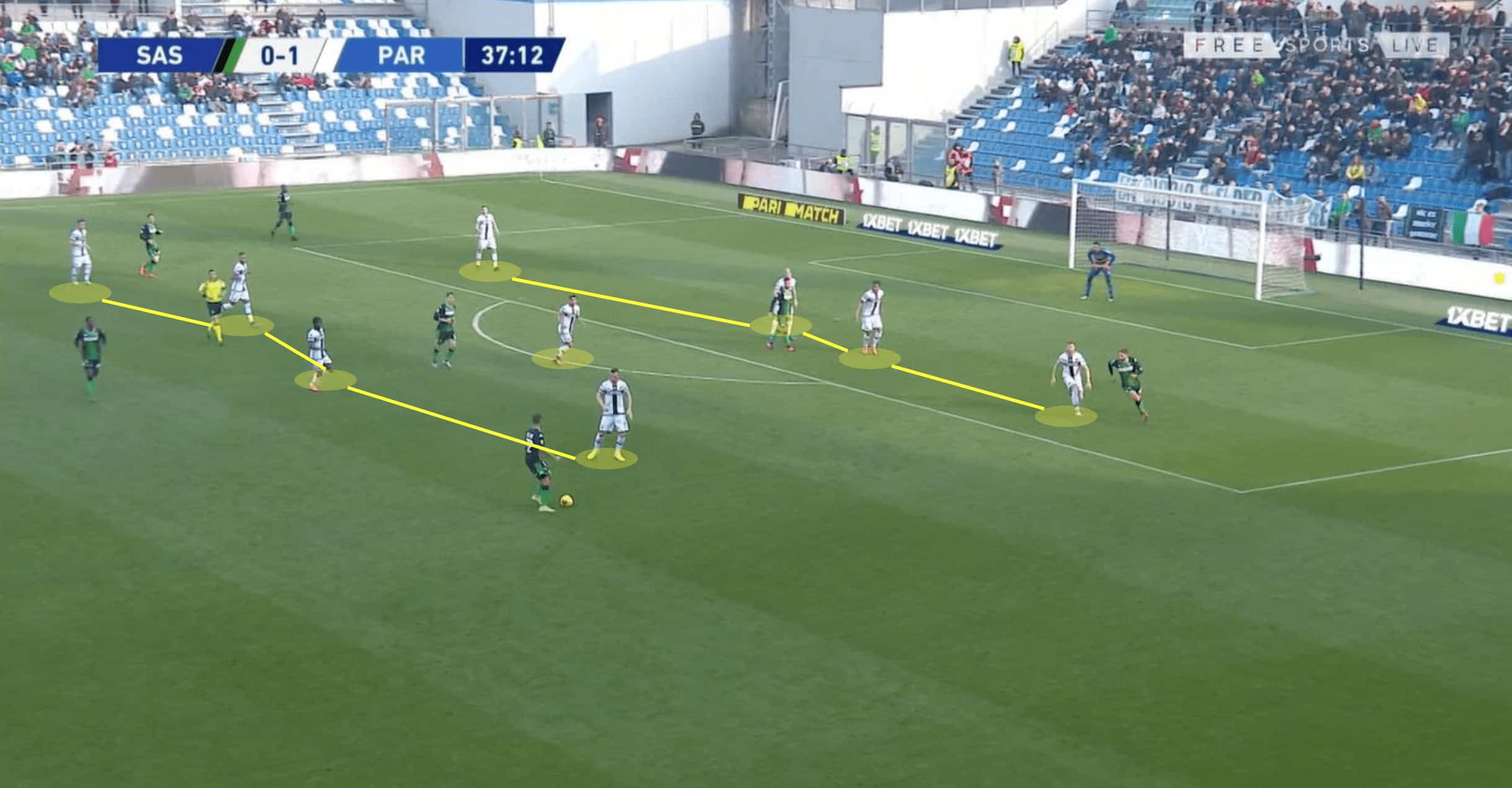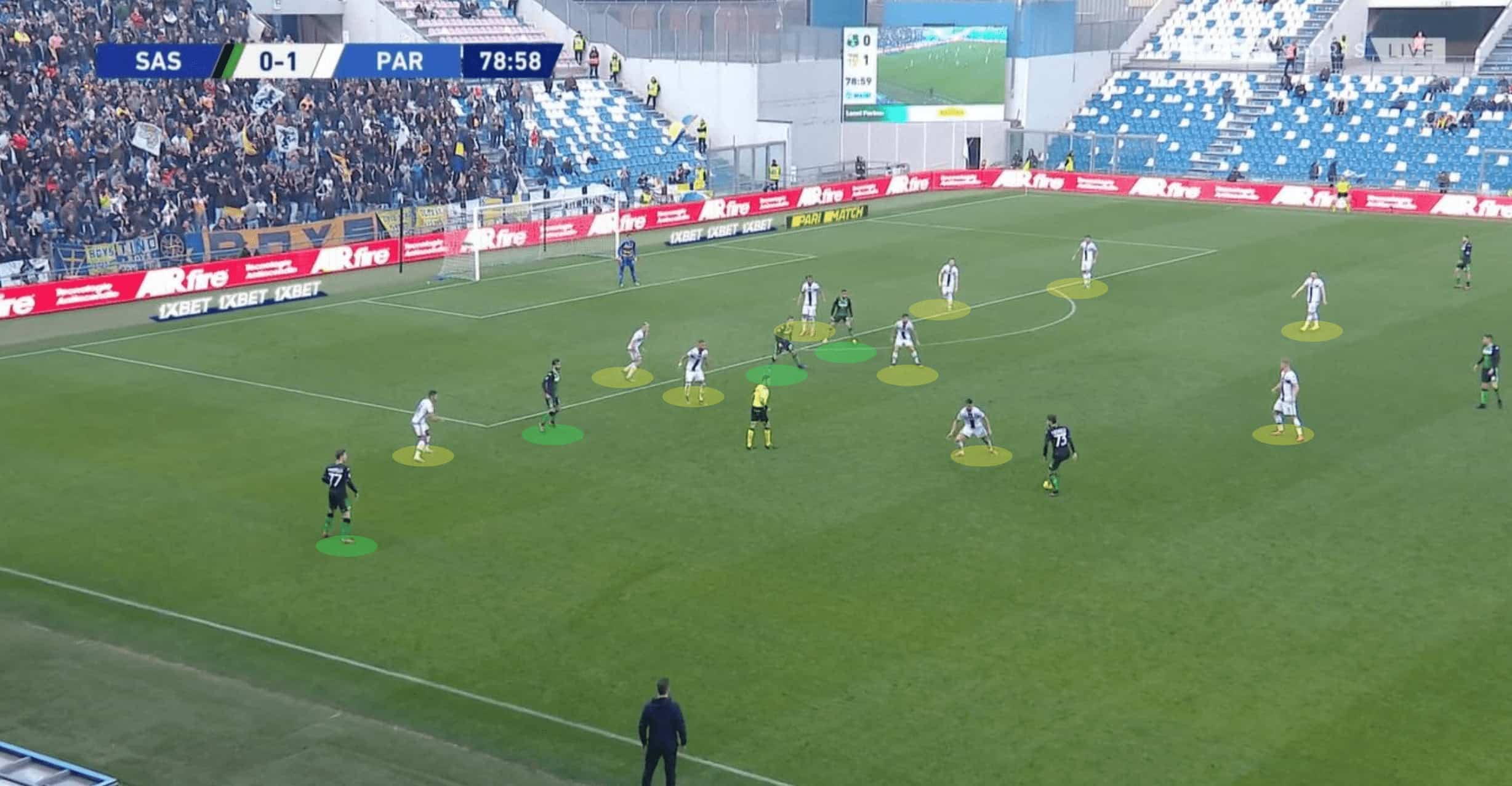 In the next image we can see another example of Parma’s defensive shape, this time adopting a 4-1-4-1 system in the defensive phase. Sassuolo are in possession of the ball, looking to progress deep into the attacking third, with their central midfielder on the ball looking for an advanced option.