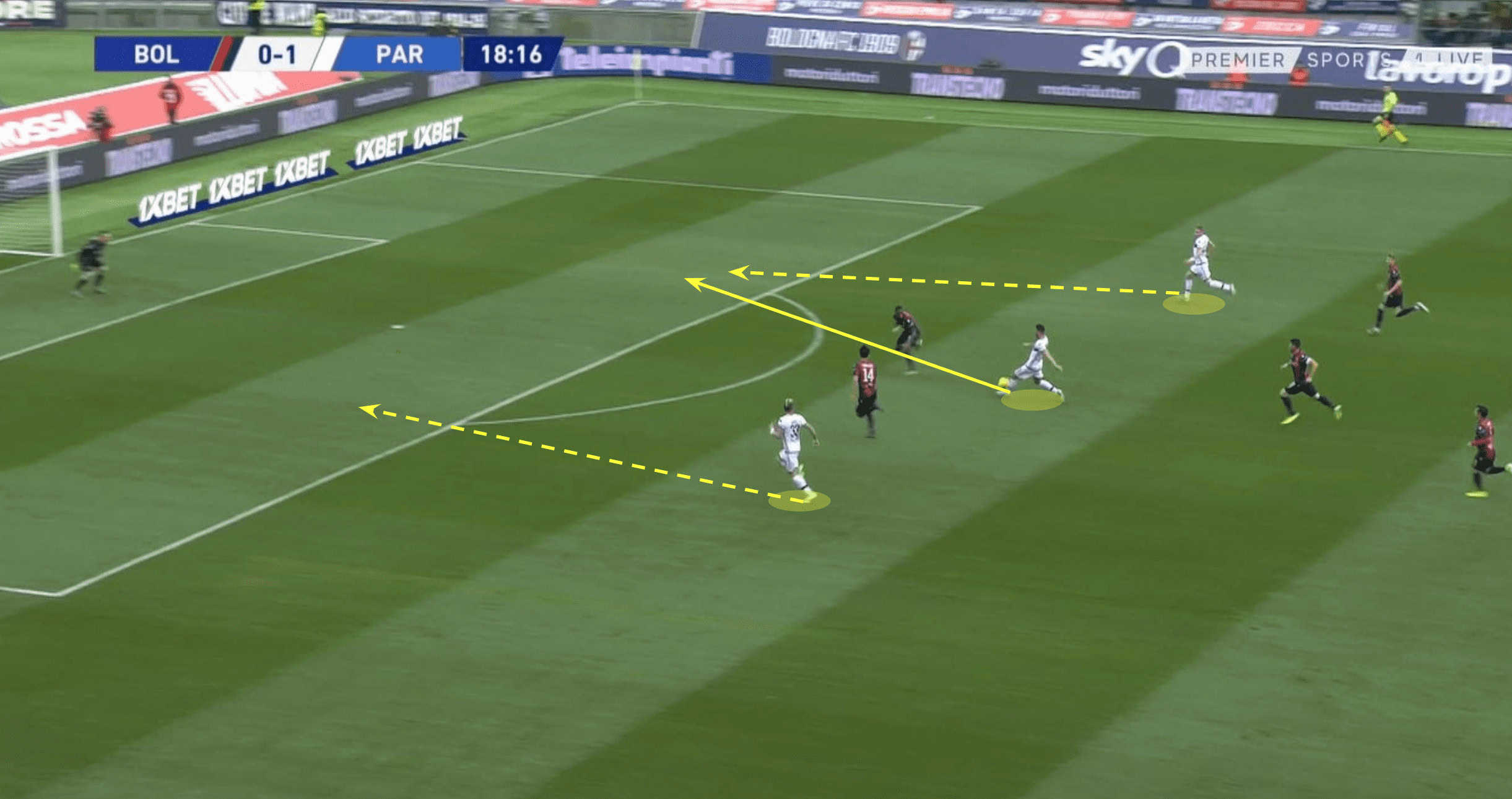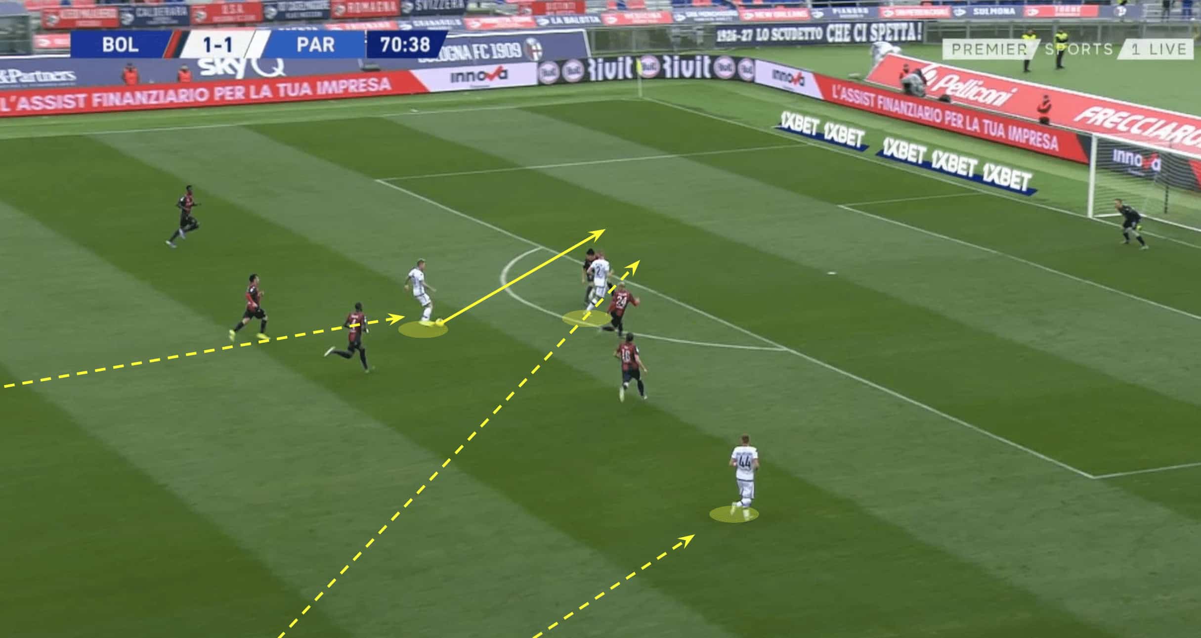 Due to Bologna over-committing to their attacking phase, lured in by Parma’s defensive shape, the forward has one man between himself and goal. The midfield knowing how effective they can be in transition due to the explosive speed and power of individuals such as Dejan Kulusevski (on loan from Juventus), look to spring from their defensive shape to support the counter at any given opportunity, resulting in a 3v2 in the attacking third, as seen below.