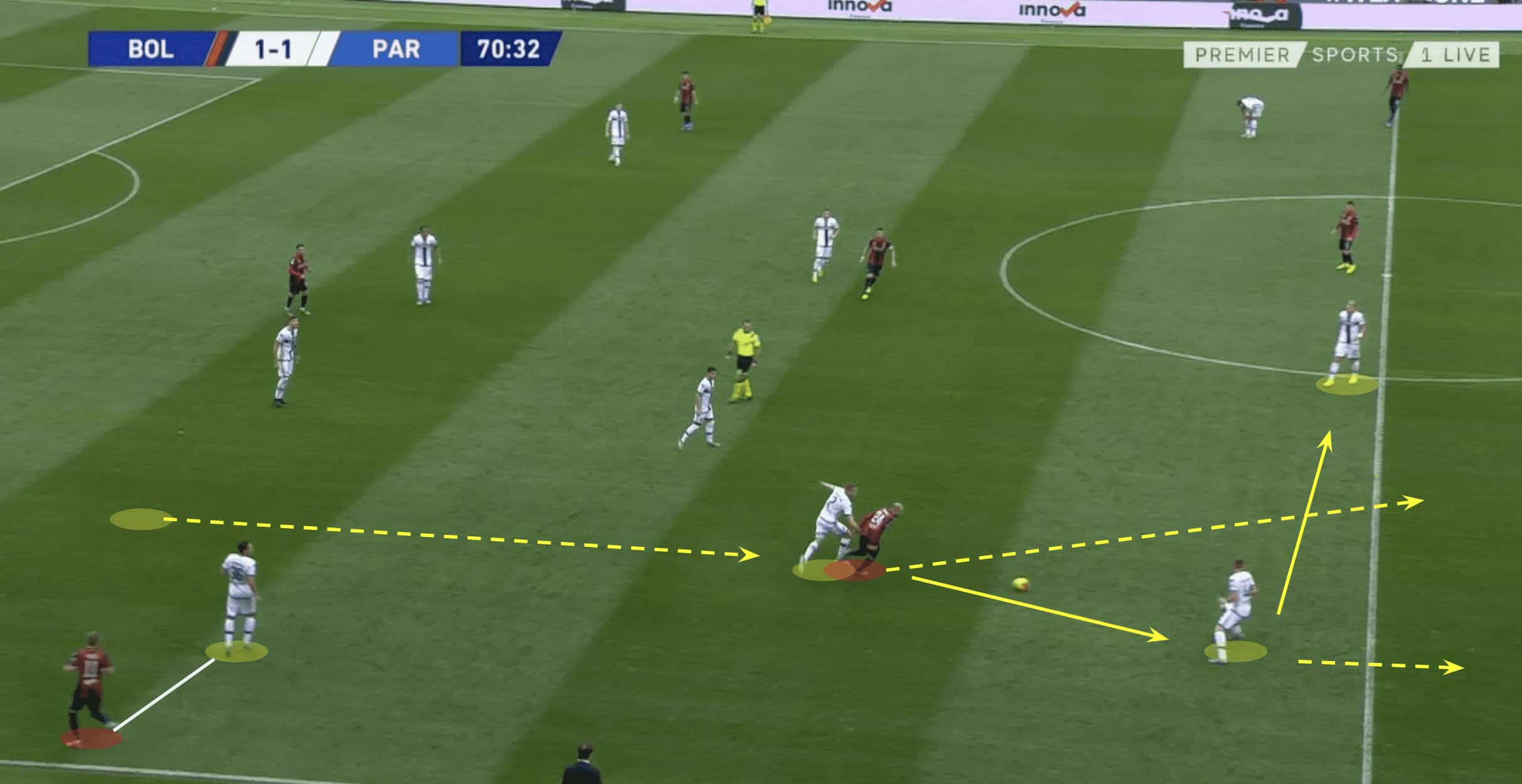 Despite there being five Bologna players between the goal and where the counter-attack initially started, Parma through Kucka were able to progress the ball to the attacking third. The supporting runs of Kulusevski and Iacoponi enabled the ball carrier to progress with the ball, forcing the defensive unit to back off to attempt to construct a block, enabling Bologna to engage in a defensive action without the risk of being isolated in a 2v1 situation.
