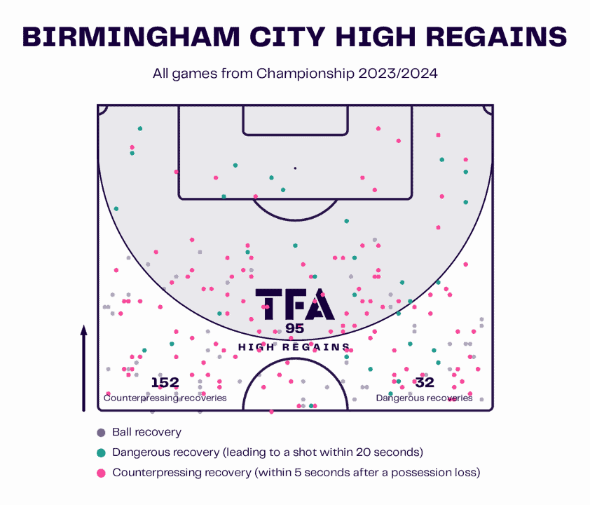 The high regains map above acts as evidence for Birmingham’s ability to apply their pressing ability, both unit and individual, in various pitch areas.