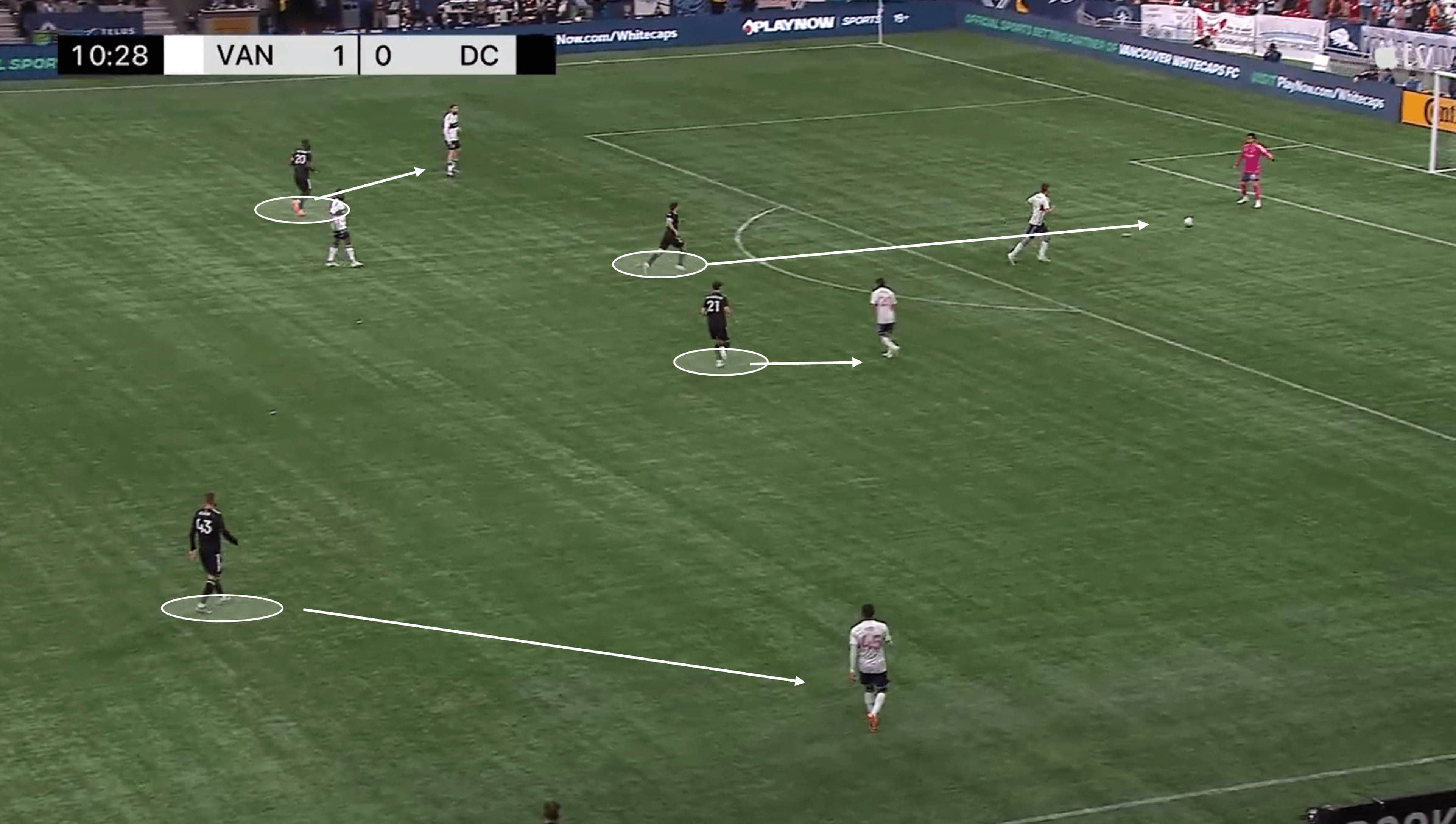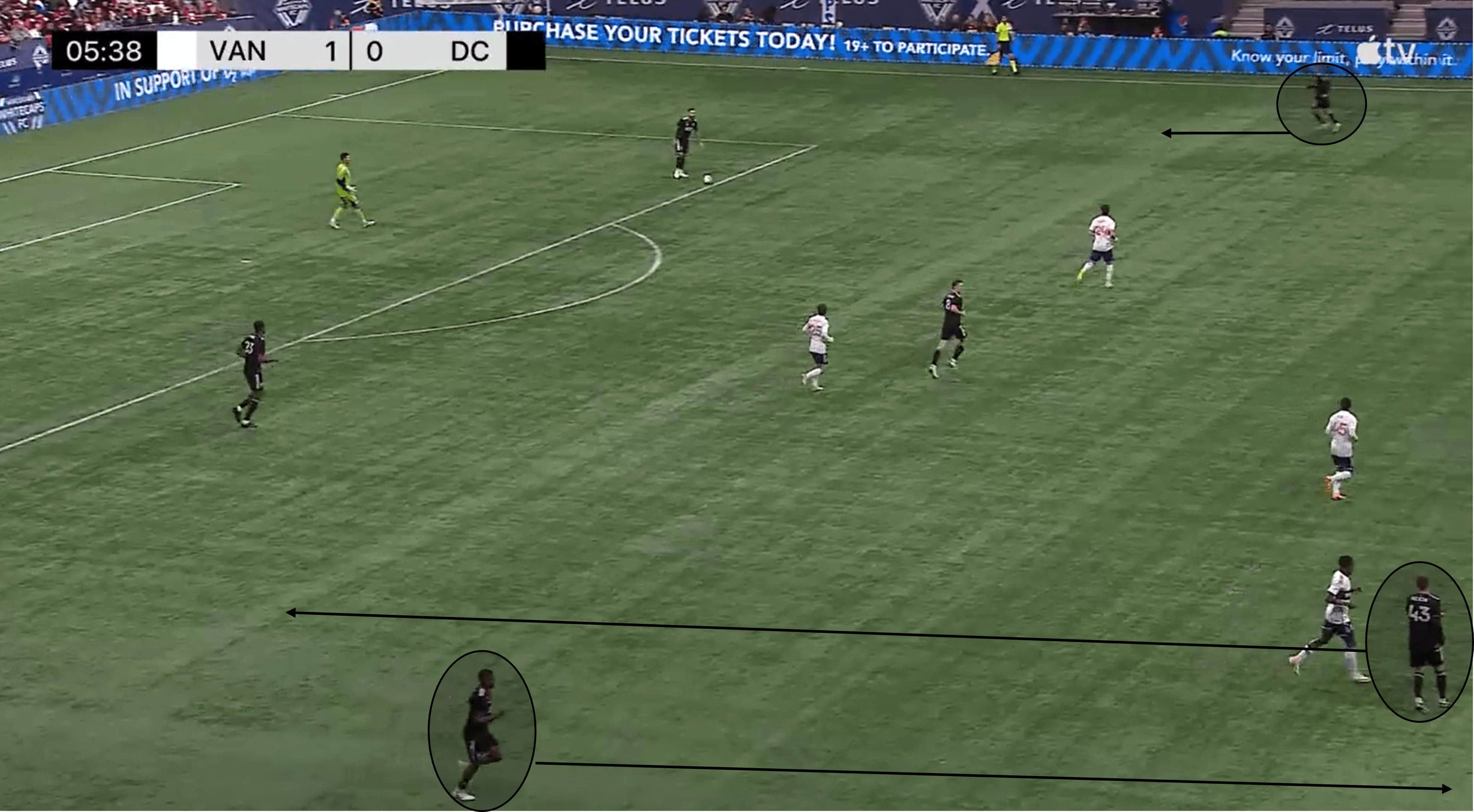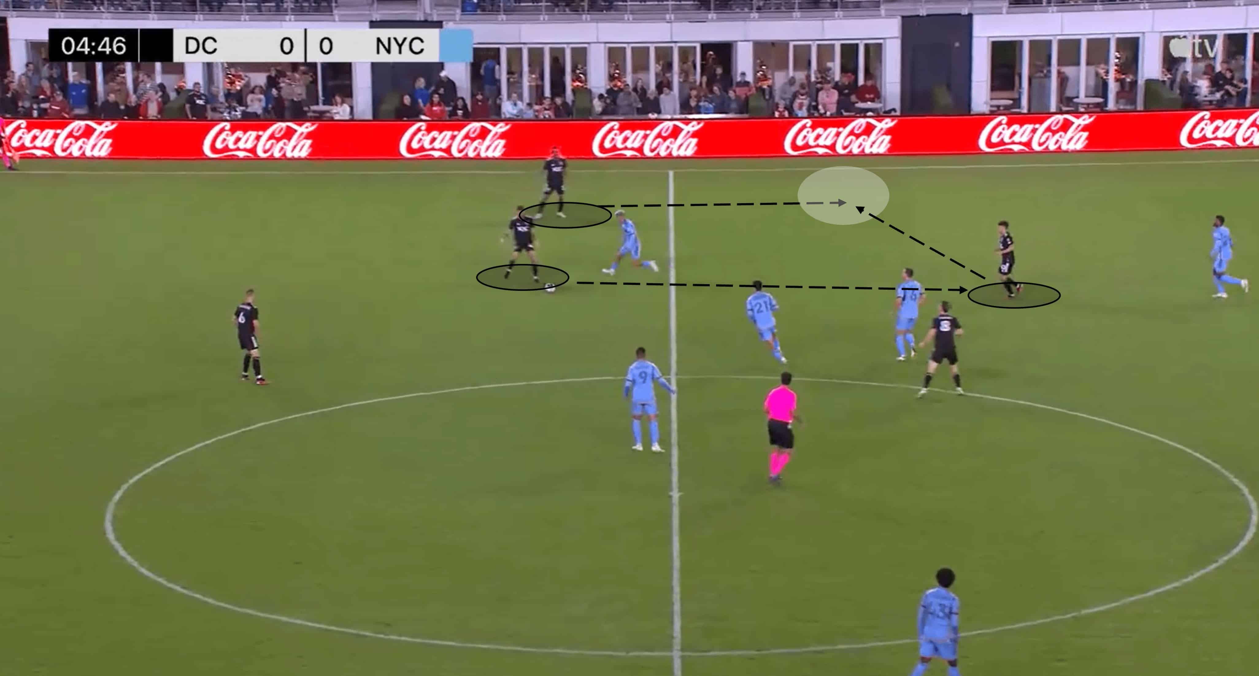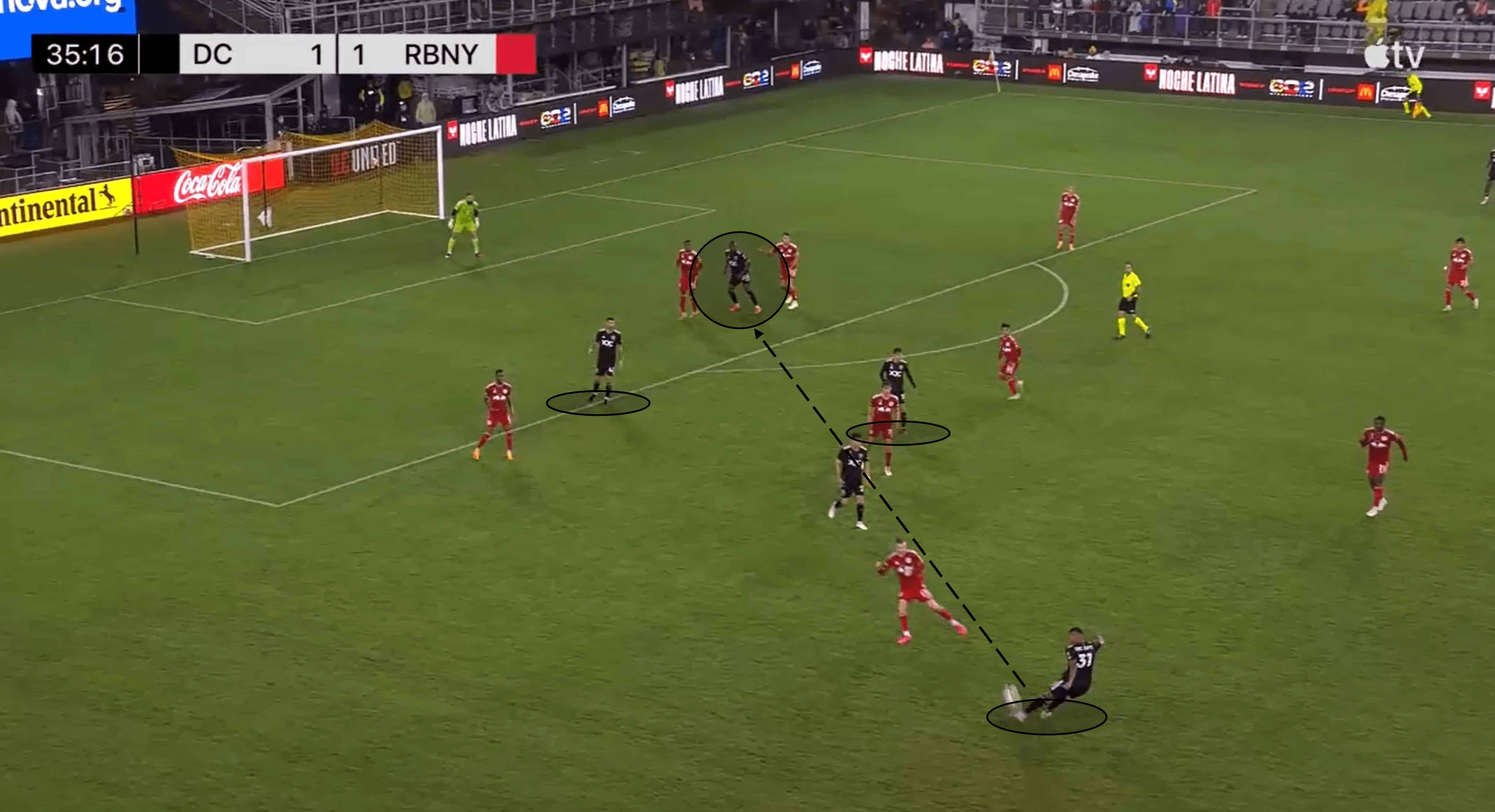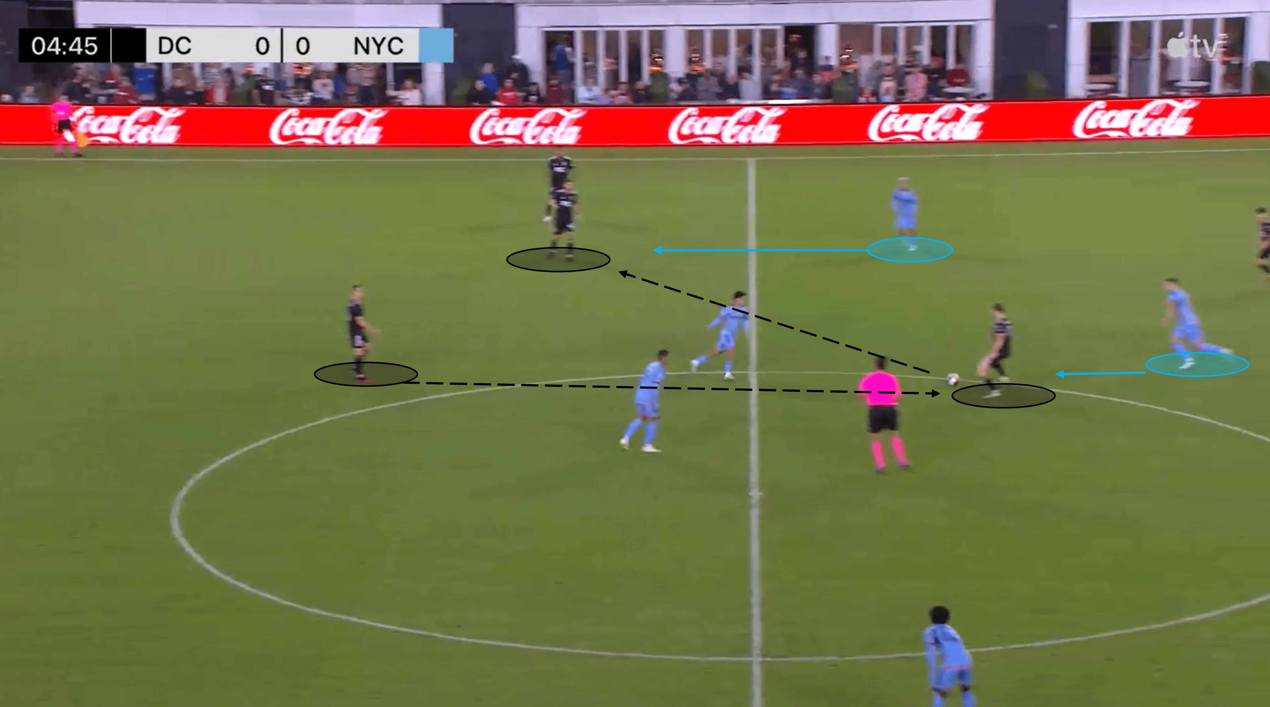 The arrival of another United midfielder in this situation adds another cog in the D.C build-up machine, and he capitalises on the space left by the opposition press.