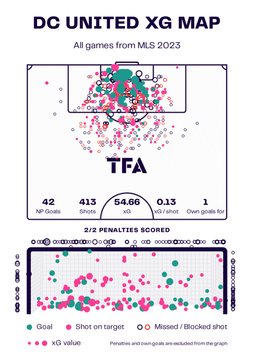 In fact, D.C were aerial masters in 2023 – they averaged 35.34 aerial duels per 90 (third highest in MLS) and were the league’s most efficient, winning 55.6% – of course, these numbers occurred in all areas of the pitch, not just the final third; the ability to be effective in the air was a clear asset to Rooney.