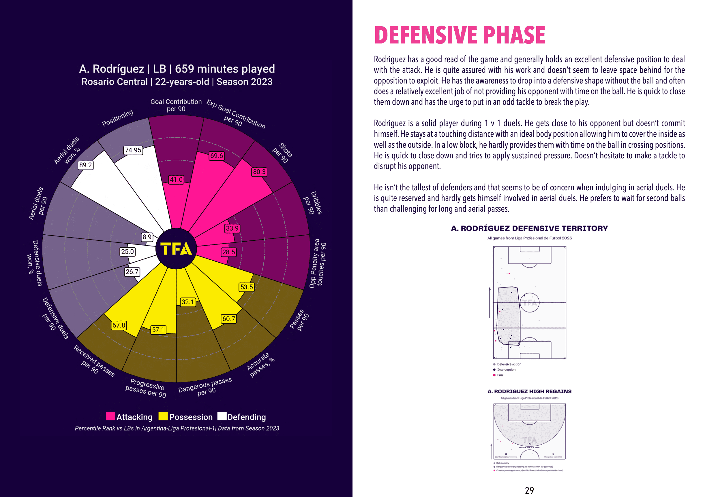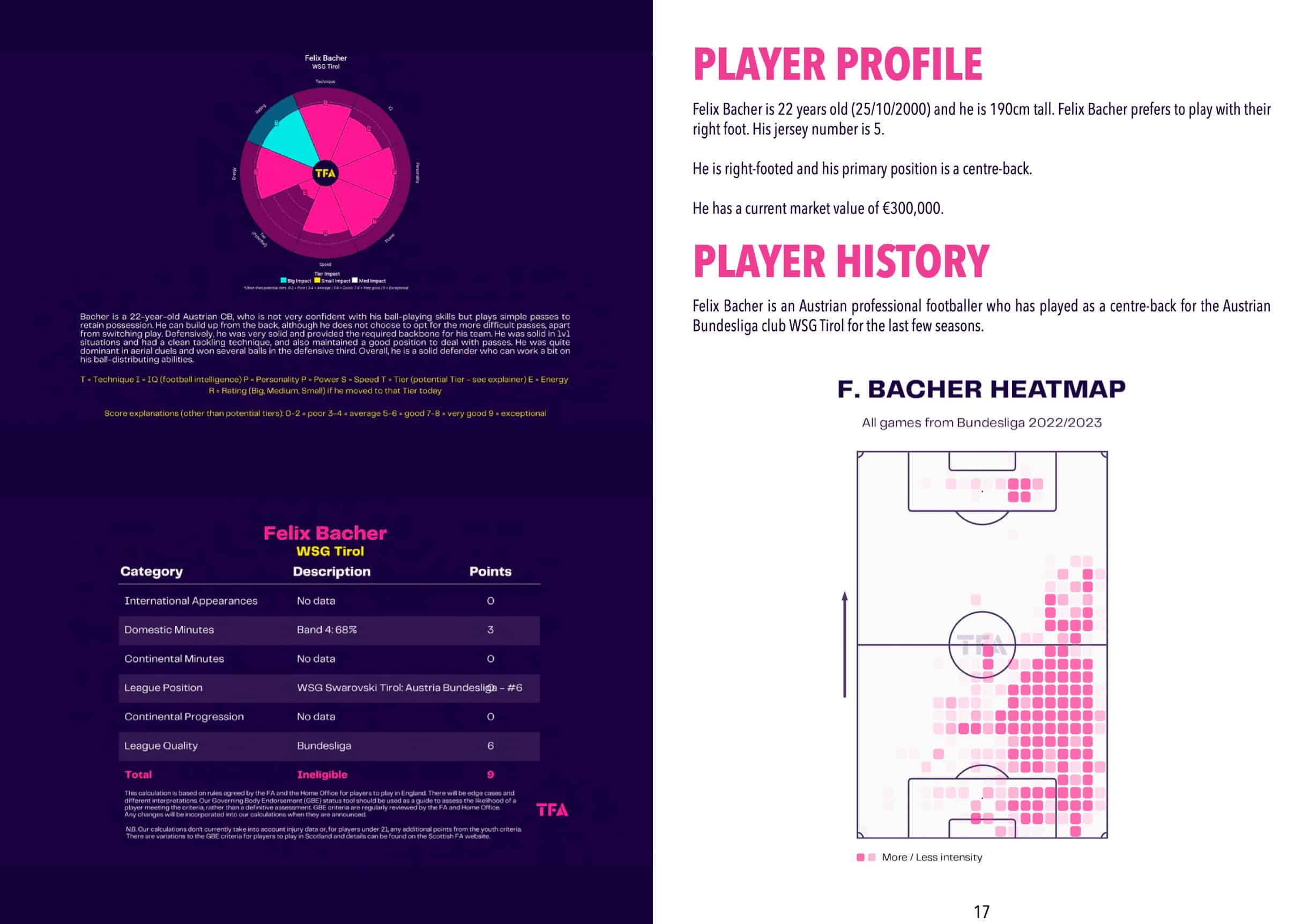 We show you our TIPPSTER scouting model in the magazine. We’ve created a unique model to help you quickly understand what tools we believe the player has around technique, pace, power, energy, IQ etc. We feel this model complements the data and visuals we have included in each report.