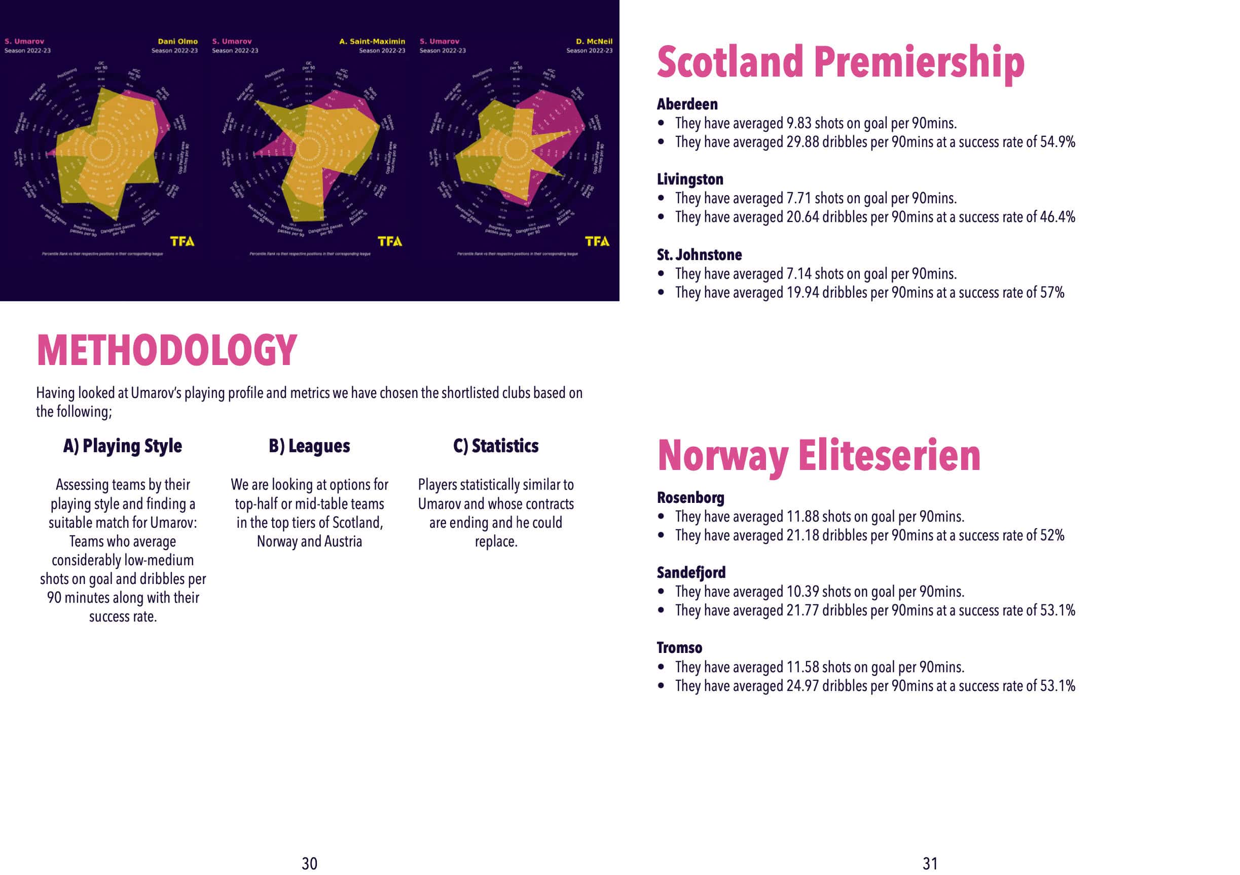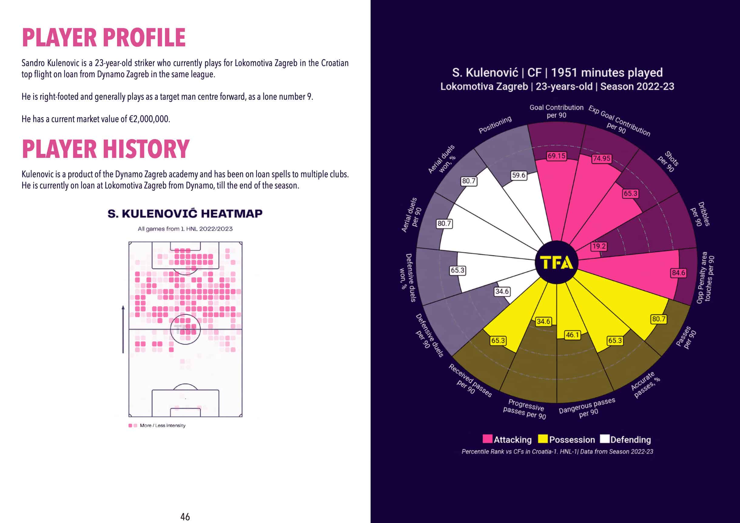 We scout each player in detail, provide you with a nice blend of what the eyes see and the data shows us and then use our internal xGOLD tool to match them to clubs we feel they could play for next in their career – again, a completely unique feature to TFA Scouted.