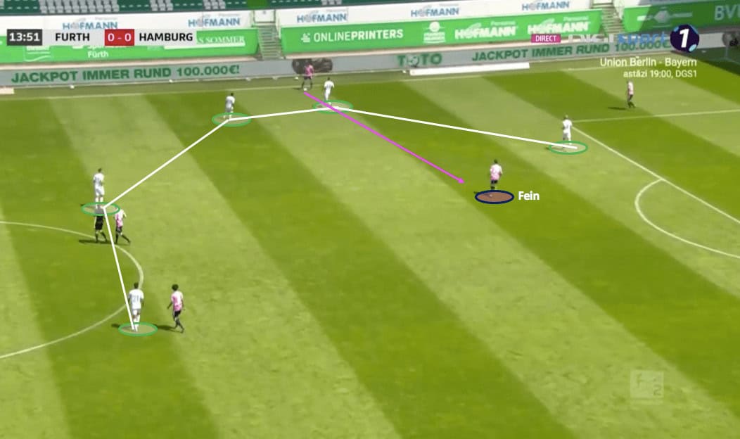 We have two examples of Hamburg successfully beating Fürth counter-pressing in the final third. Fürth defends in a 4-3-3 which is narrow at the top, it requires a stable work rate to ensure no holes are exploited. The one weakness with this set-up is when teams can switch the ball quickly. Vagnoman has possession and is challenged by Branimir Hrgota while the shape is set. Fürth wants to force Hamburg either backwards or down the line. Fortunately for Hamburg, Vagnoman is composed and finds on-loan Bayern Munich midfielder, Adrian Fein.