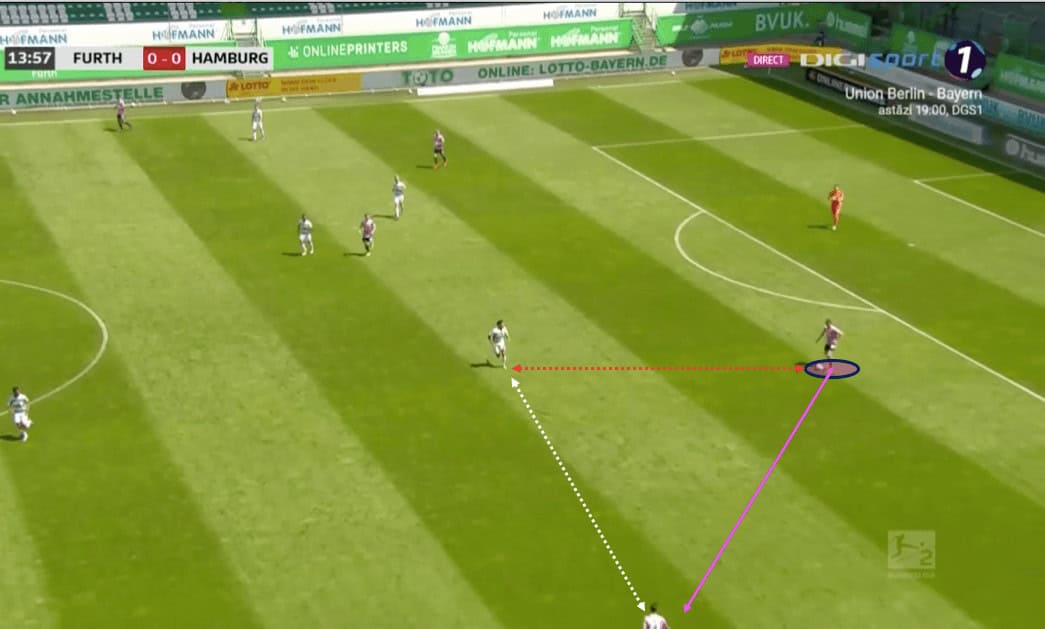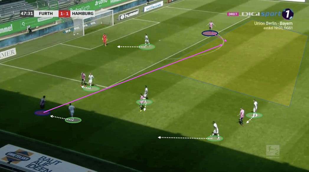 We start at the edge of halfway, and in the first half, this was quite an often situation. Hamburg playing a 4-5-1 defensively up to half time, its narrow shape allowing for options out wide for Paul Seguin. 75% of the attacks came from the left-hand side for Fürth, and with the spaces to exploit, Seguin finds Wittek in stride. Fürth can utilise the wide areas as the defensive four plays tight, trying to nullify the influence and options of the attacking three. Yet, as the wingers for Hamburg don’t track back, this allows the full-backs to play a prominent role.